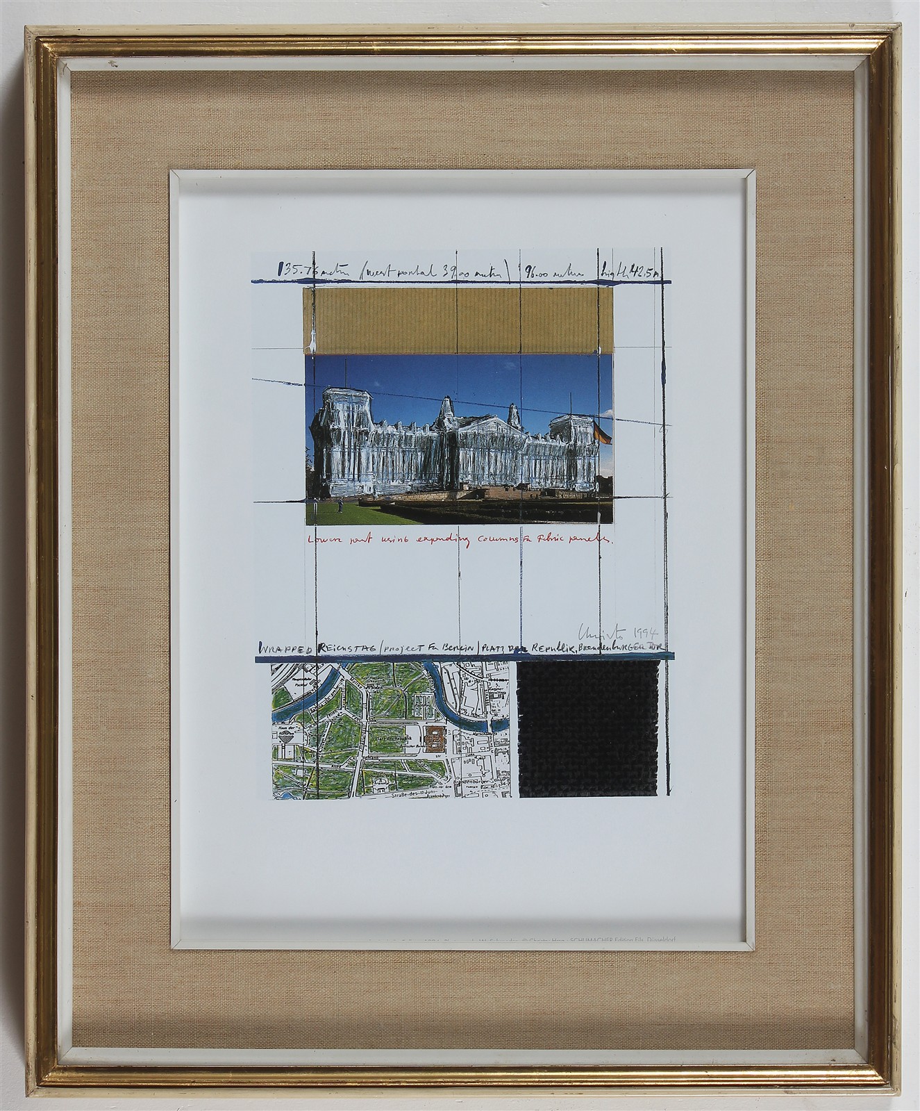 CHRISTO (n. 1935) Drapped Reichstad. 1994. Litografia. Cm 20,50 x 28,00. Firma e anno a stampa in basso a destra. Cornice presente
