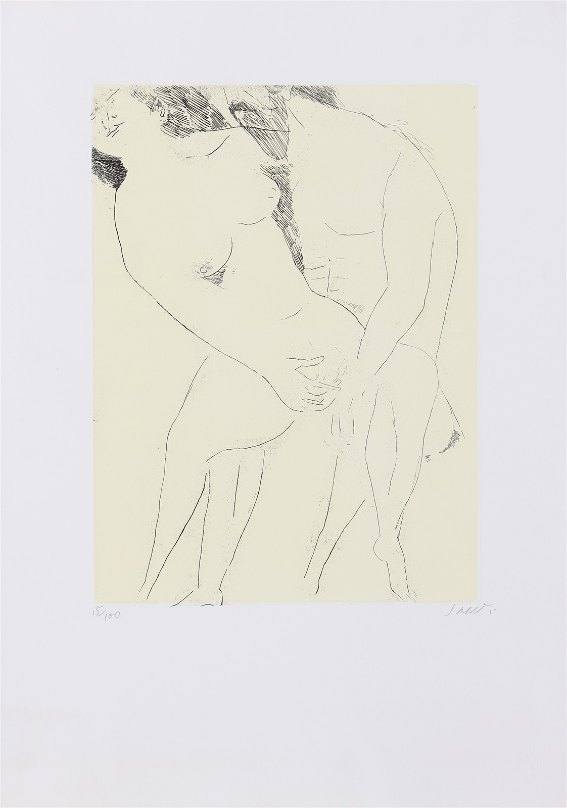 SAETTI BRUNO (1902 - 1984) Coppia. Acquaforte su fondino litografico. Cm 35,00 x 50,00. 15/100. Firma e numerazione a mano dell'artista, dimensioni lastra : 32x23.5 cm. Timbro a secco e descrizione a cura di Modern & Contemporary Art, Venezia.