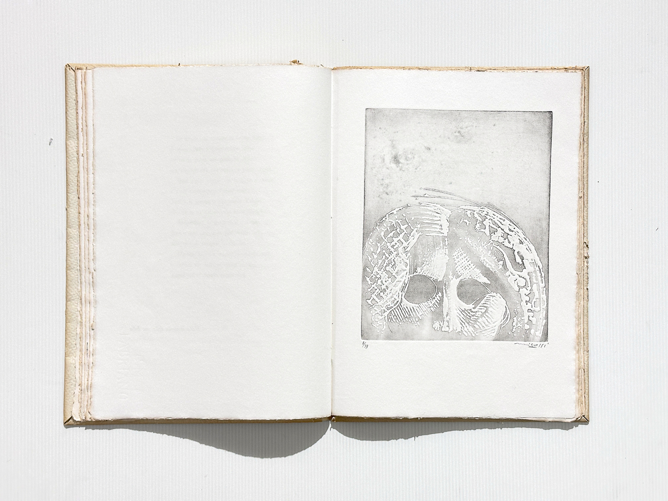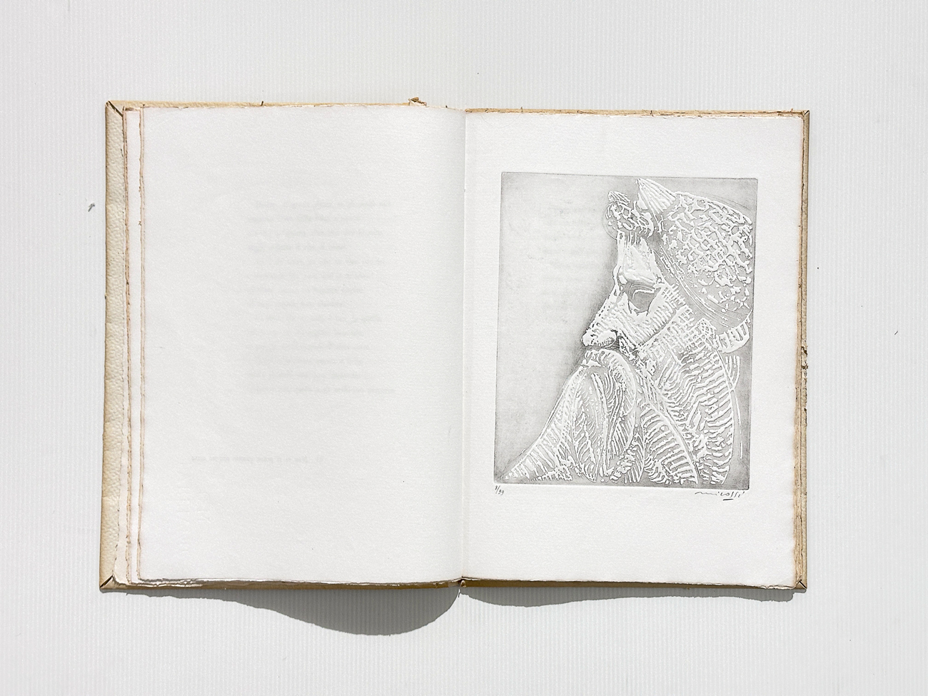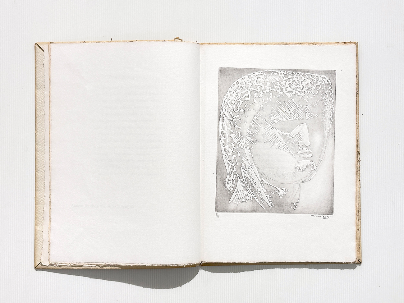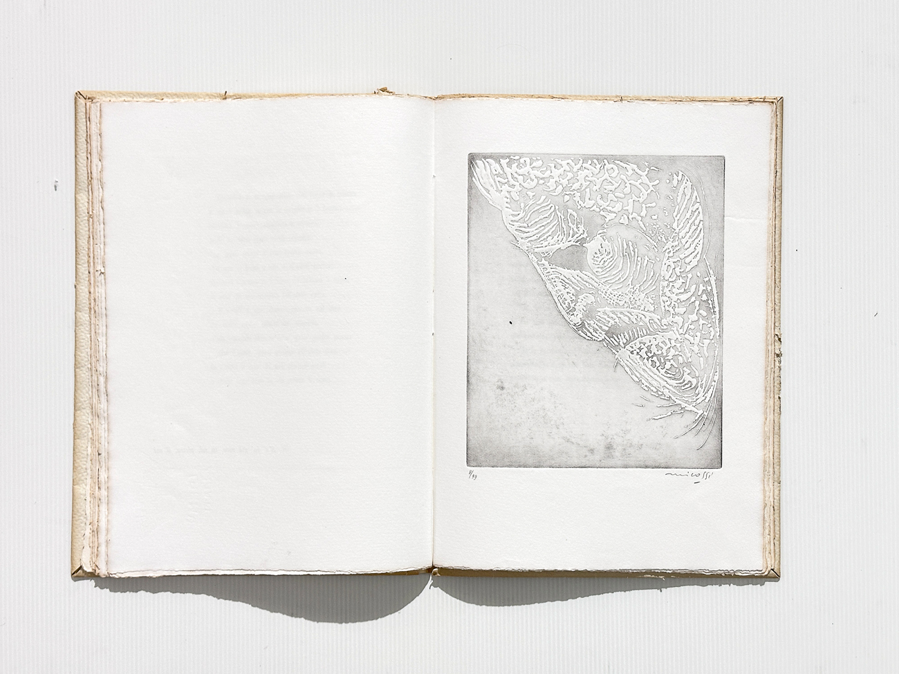 Edizione d'arte contenente 20 sonetti illustrati da 6 acqueforti di Mario Micossi, ciascuna recante firma e numerazione (Esemplari 8/99) a matita al fronte