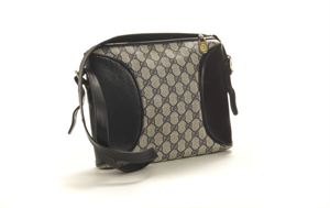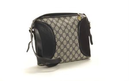 GUCCI Borsa tracolla in pelle nera e tessuto plastificato con logo, forma rettangolare, chiusura con cerniera, anni '70 Cm 23x30 1970's rectangular logo leather and plastic coated fabric shoulder bag with zip closure. Small imperfections on the shoulder strap
