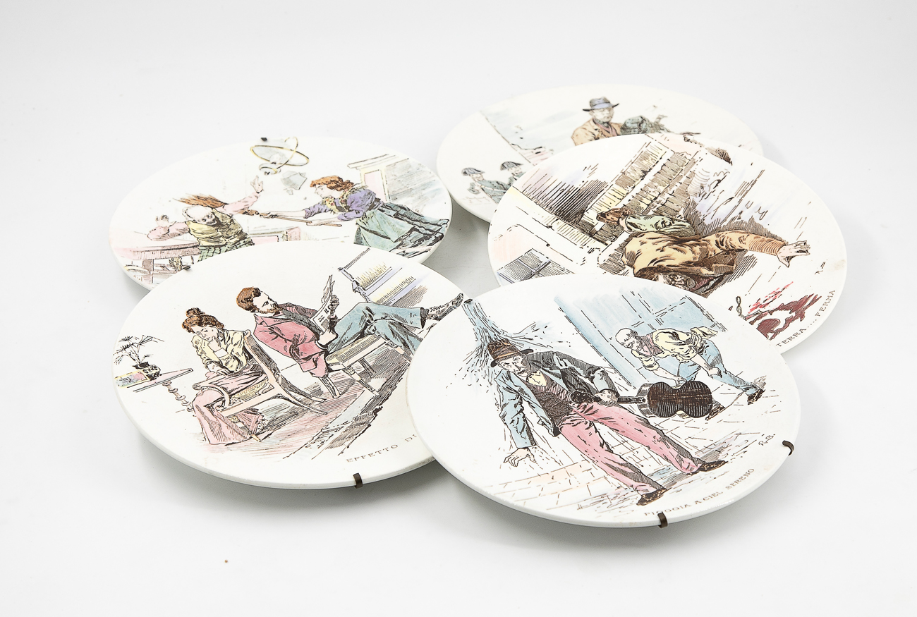 Lotto unico di 5 piatti realizzati dalla Società Ceramica Richard (Serie 'Elementi': Terra..ferma; Pioggia a ciel sereno; Effetto di luna; Aria cattiva; Grandine al coperto)