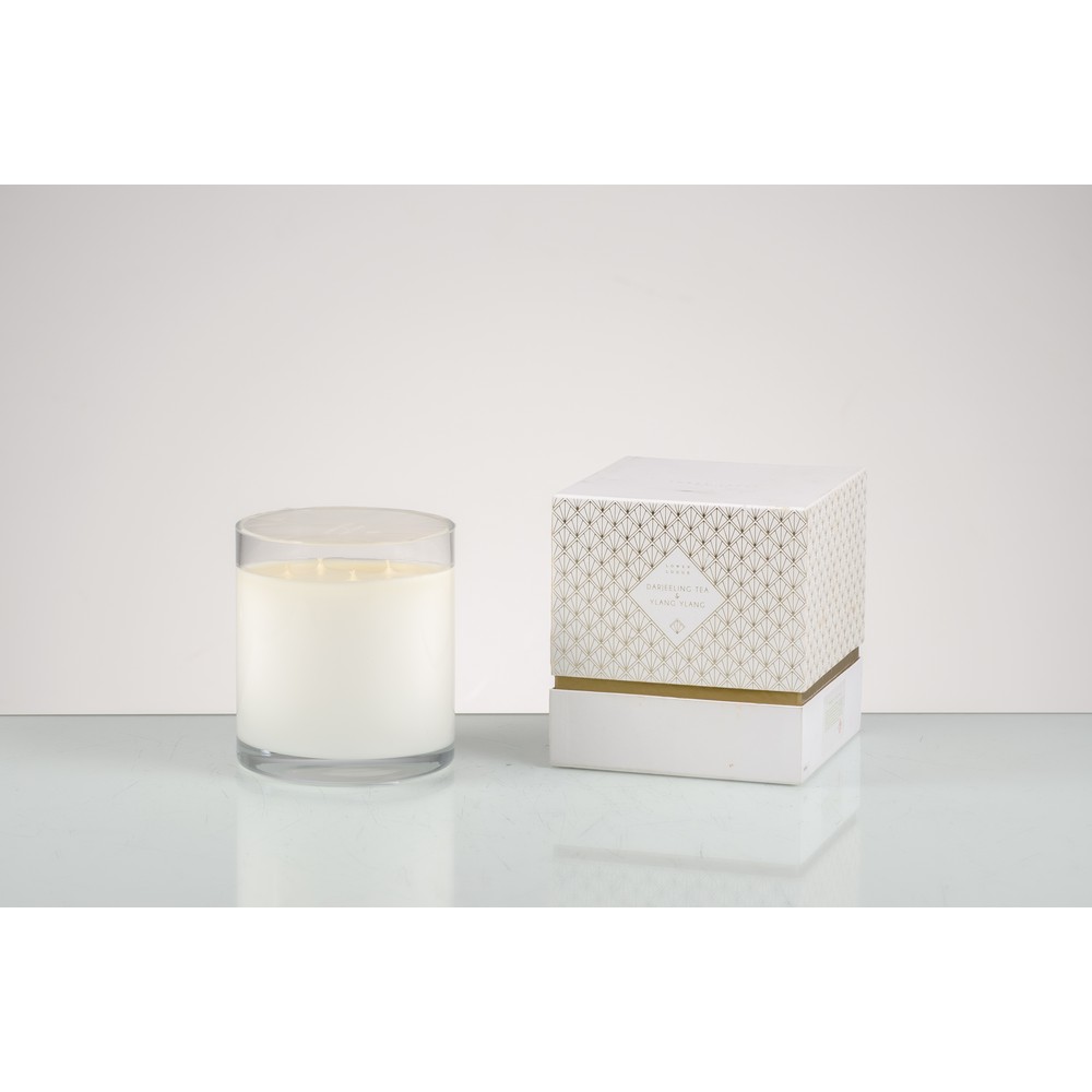Grande candela profumata con contenitore in vetro incolore cilindrico, scatola originale. Marchio di produzione.