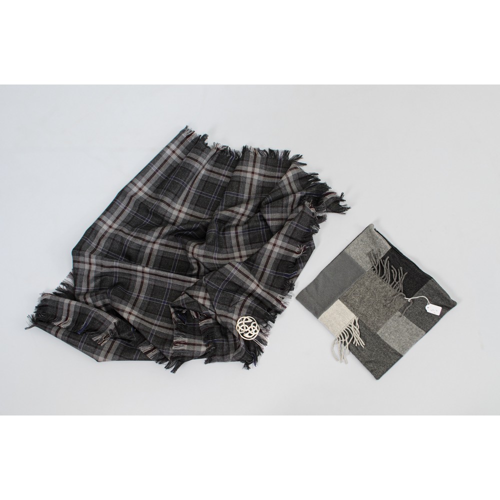 Kilt in lana tartan nei toni del grigio e bordeaux, fibbia di chiusura circolare in metallo argentato. Un cuscino in Cachemere nei toni dei grigi, marrone e panna, chiusura con cerniera.