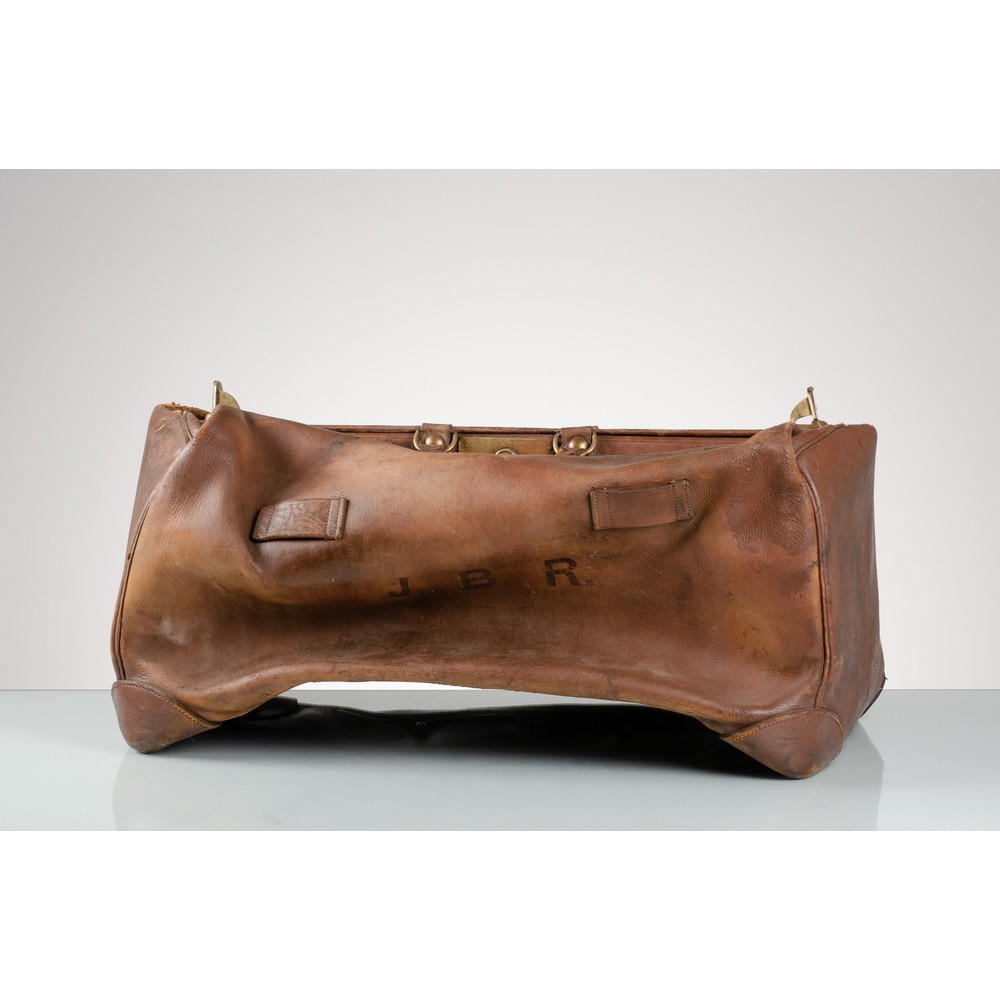 Una grande borsa da viaggio modello “doctor bag” in cuoio marrone, minuterie in ottone, monogramma J B R. Segni di uso e difetti.
