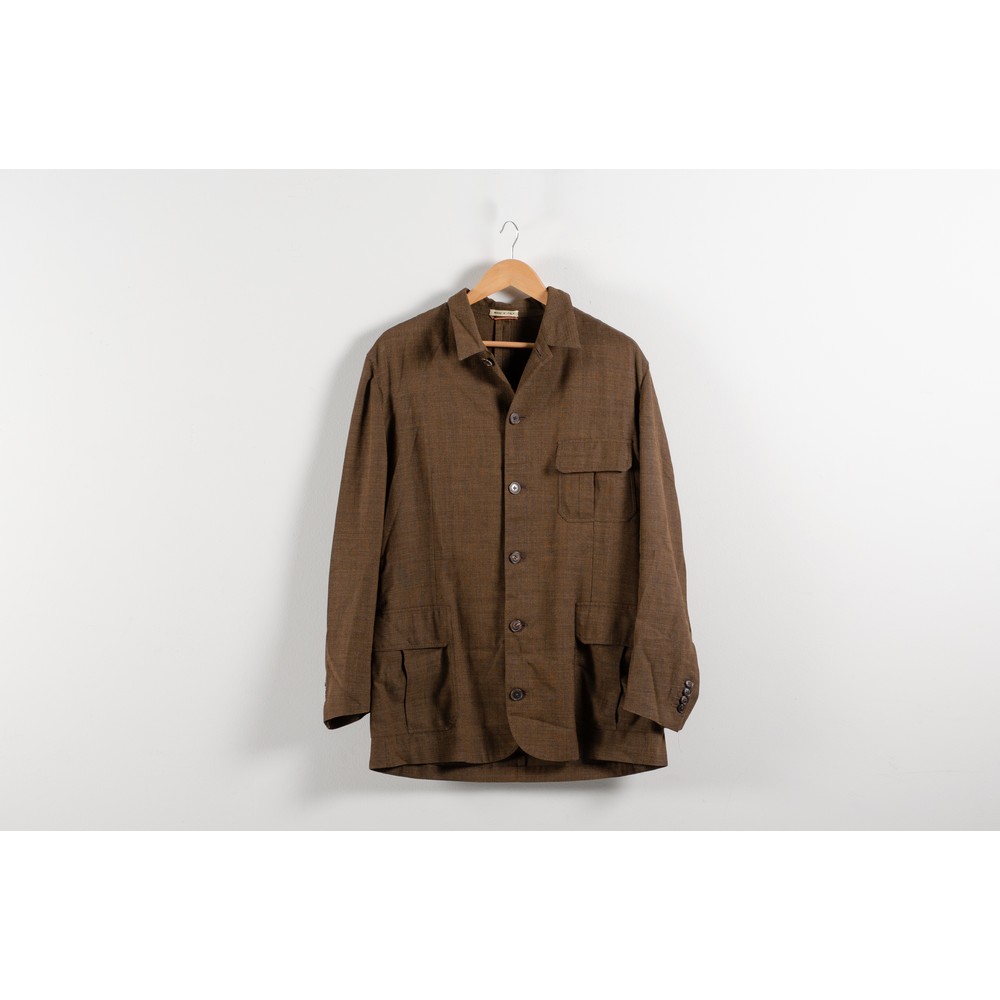 Giacca in lino marrone, apertura frontale con sei bottoni, due tasche basse ed un taschino. Taglia XL. Etichetta di produzione.