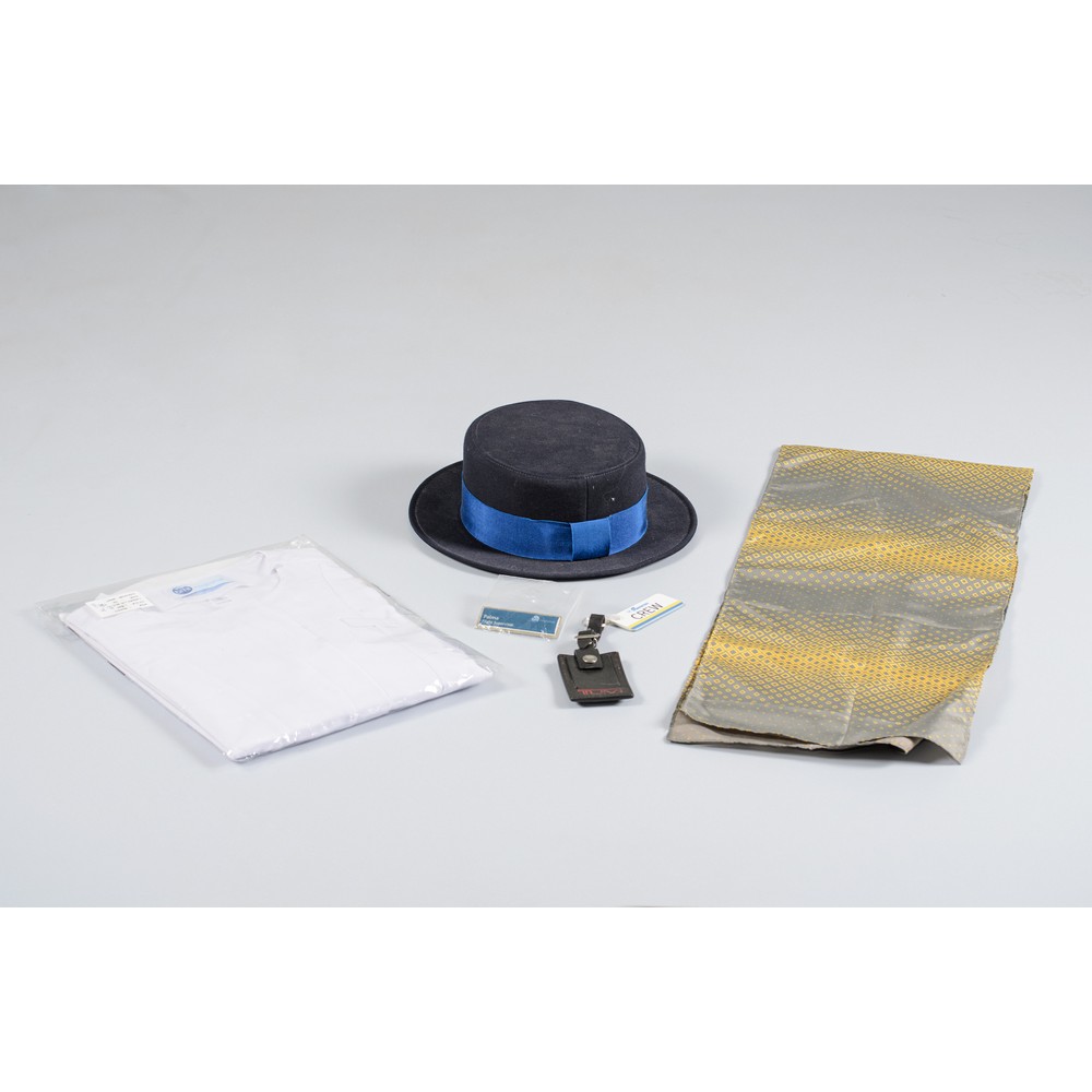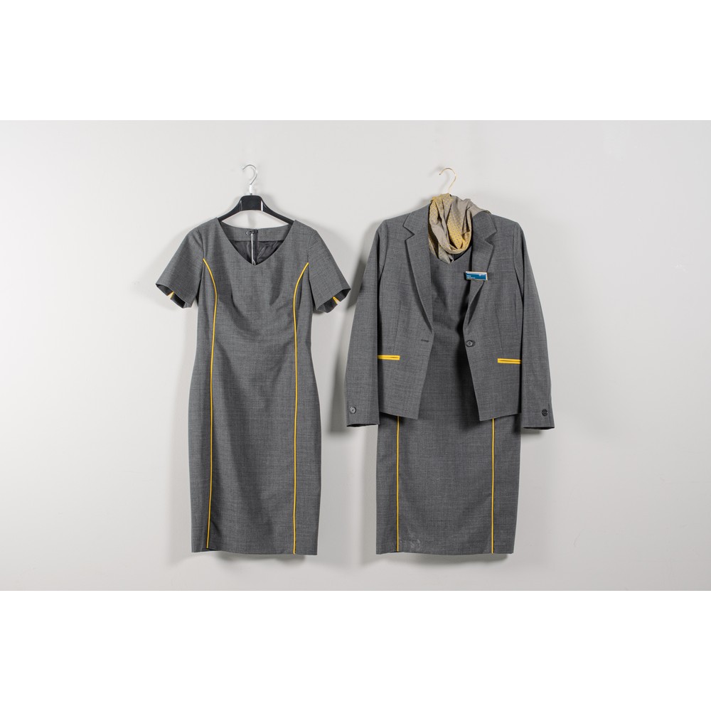 Completo da hostess composto da due vestiti ed una giacca in fresco di lana grigio e giallo, due foulard, un cappello, un grembiule bianco ed un cartellino. Segni di uso.