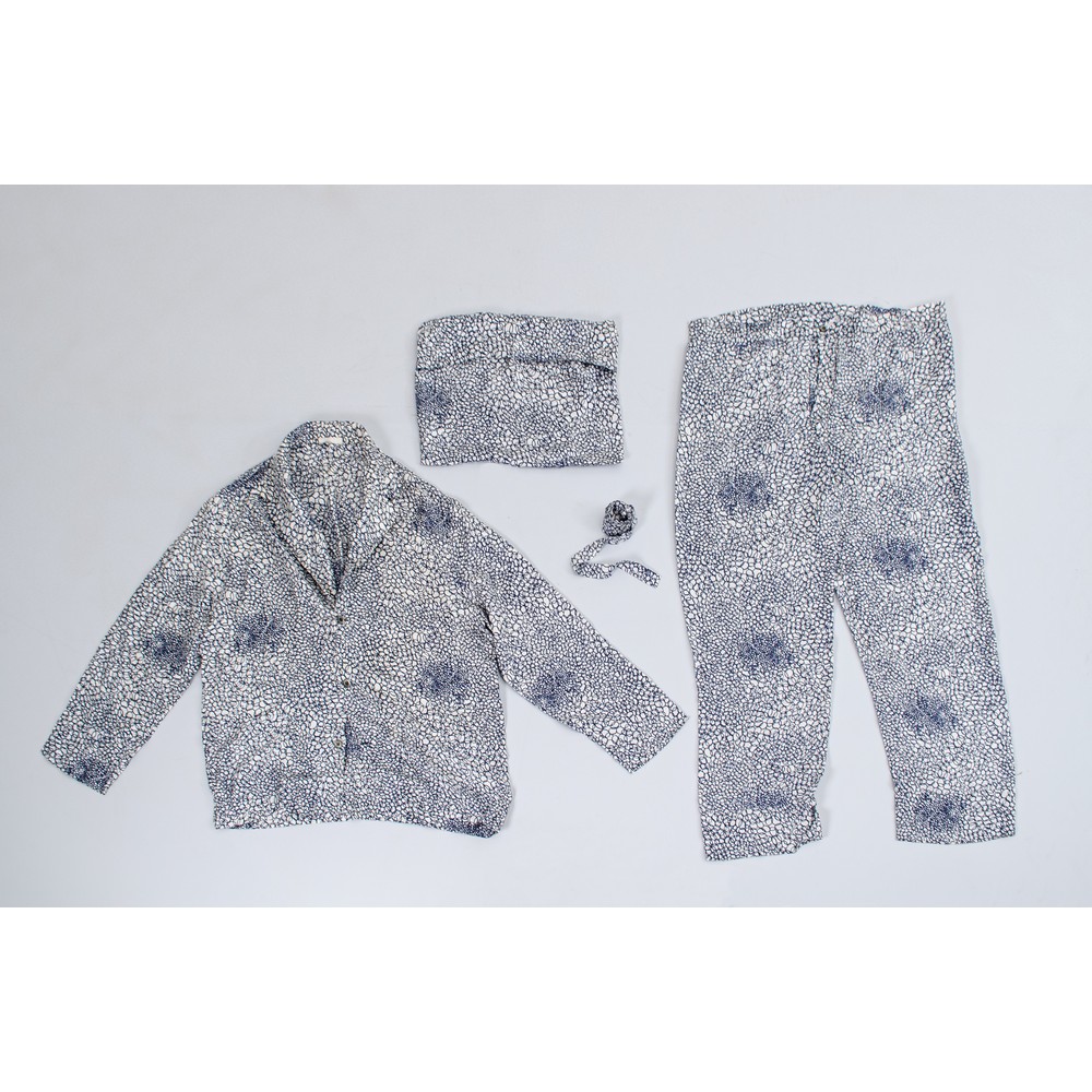 Pigiama in seta a decoro blu e bianco composto da giacca e pantaloni. Taglia XL. Dustbag in seta. Segni di uso. Marchio di produzione.