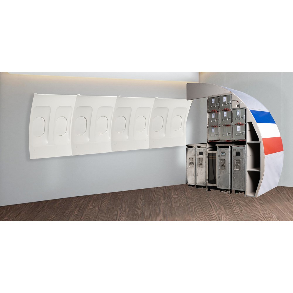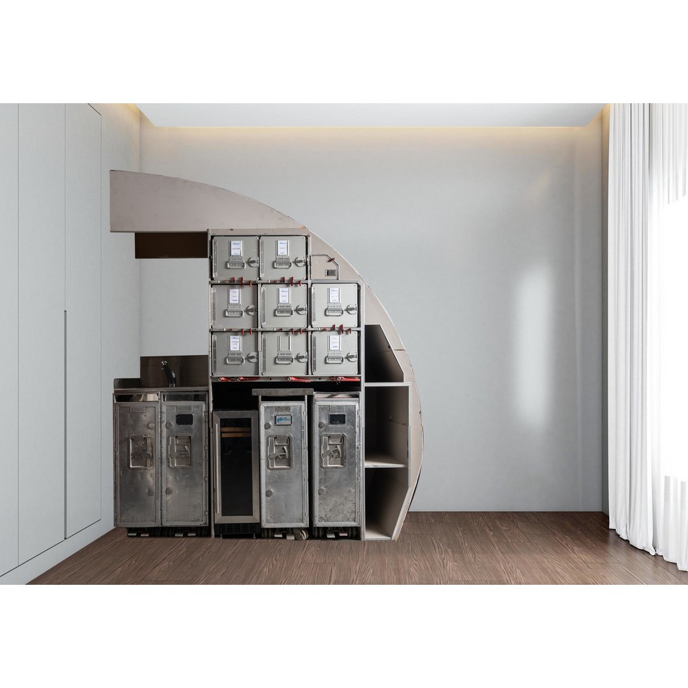 Una cucina realizzata con parte di aereo Boeing 737, lavello interrato Smeg, miscelatore, carrelli da servizio a bordo, parte di finestrini passeggero, cantina frigo. Segni di uso.