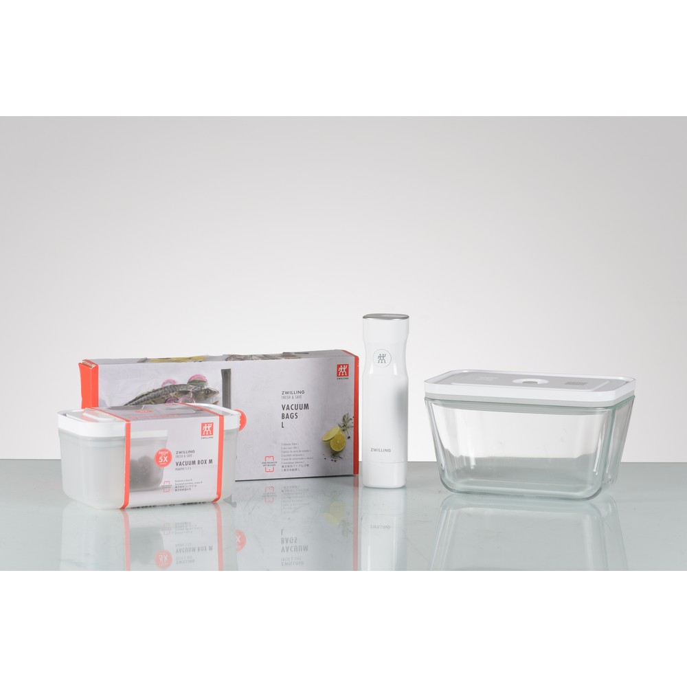 Una macchina per sottovuoto con due contenitori uno in vetro e l’altro in plastica, sacchetti per sottovuoto. Carica batterie mancante. Marchio di produzione.