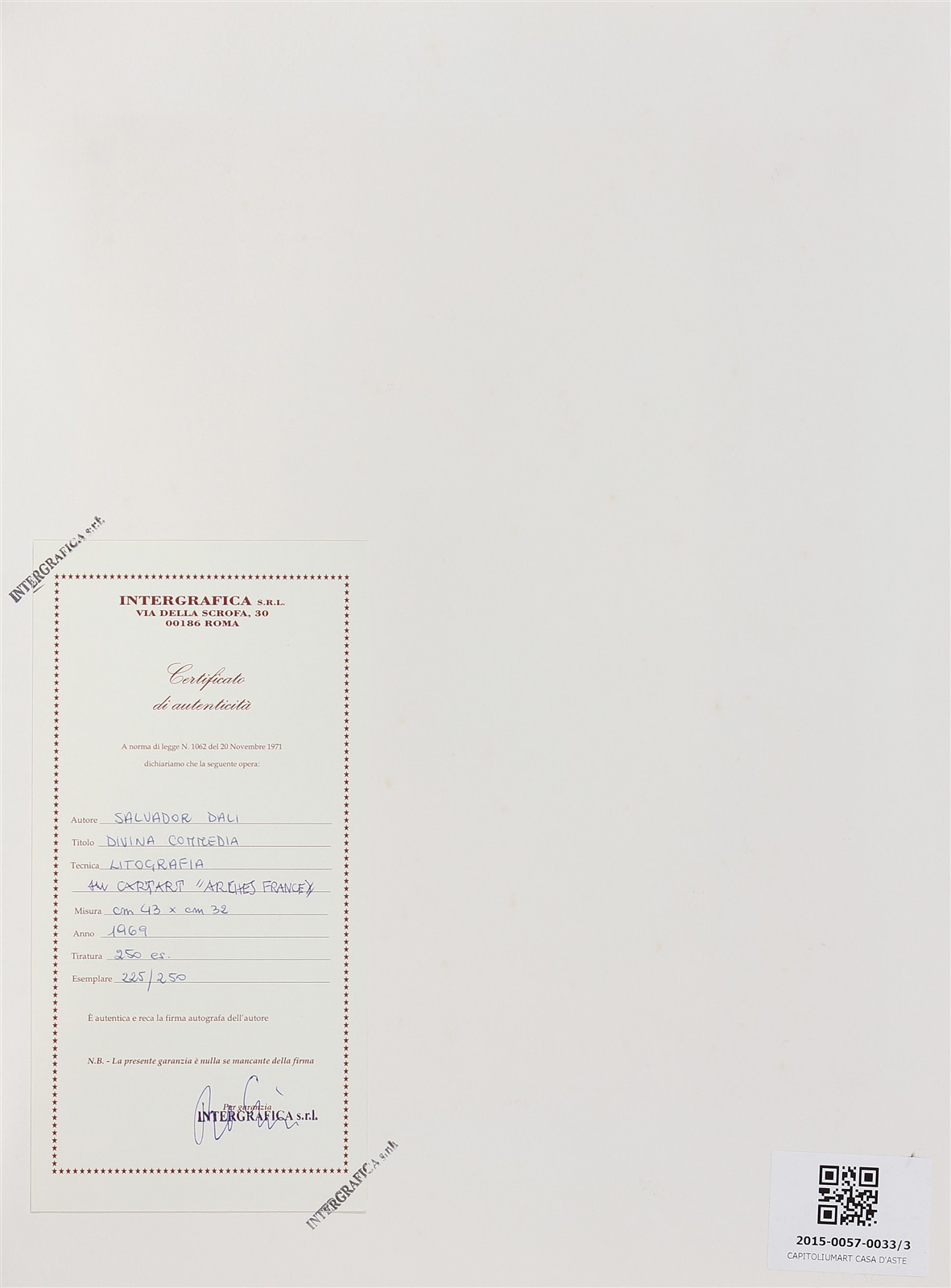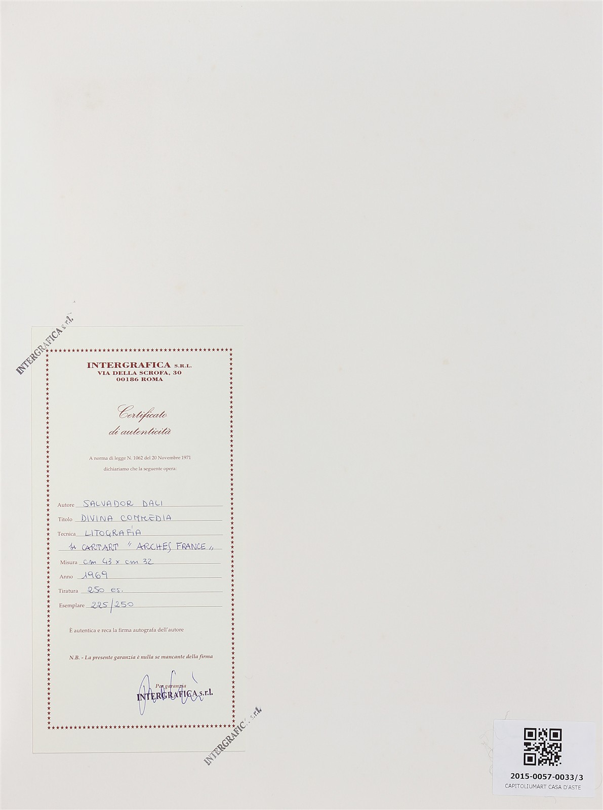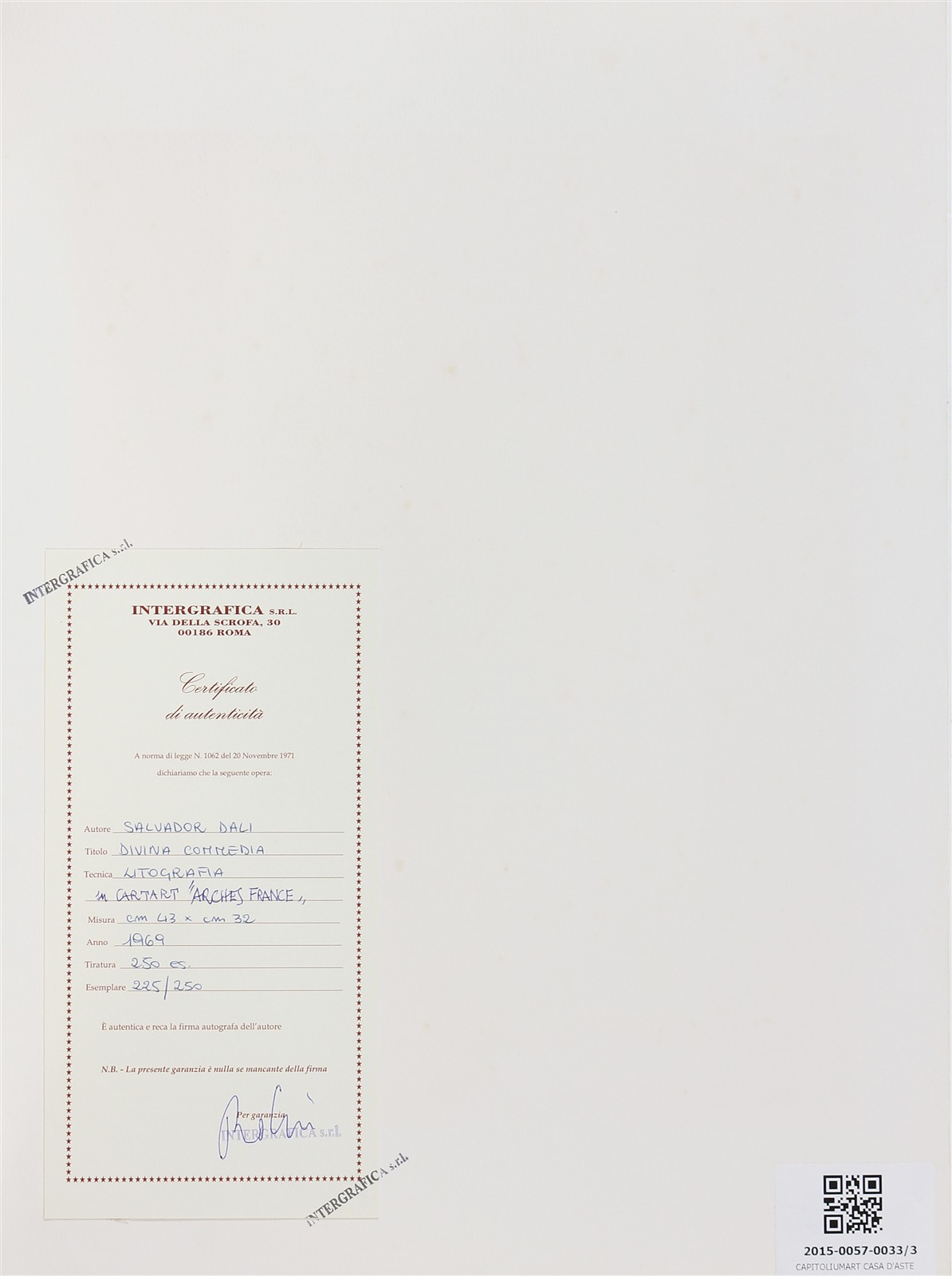 DALI' SALVADOR (1904 - 1989) Lotto composto da n. 3 grafiche. Divina Commedia. Litografie. Cm 32,00 x 43,00. 225/220. Tutte le grafiche presentano la stessa tiratura e firma a matita in basso. Certificato di autenticità a cura di Intergrafica srl, Roma.