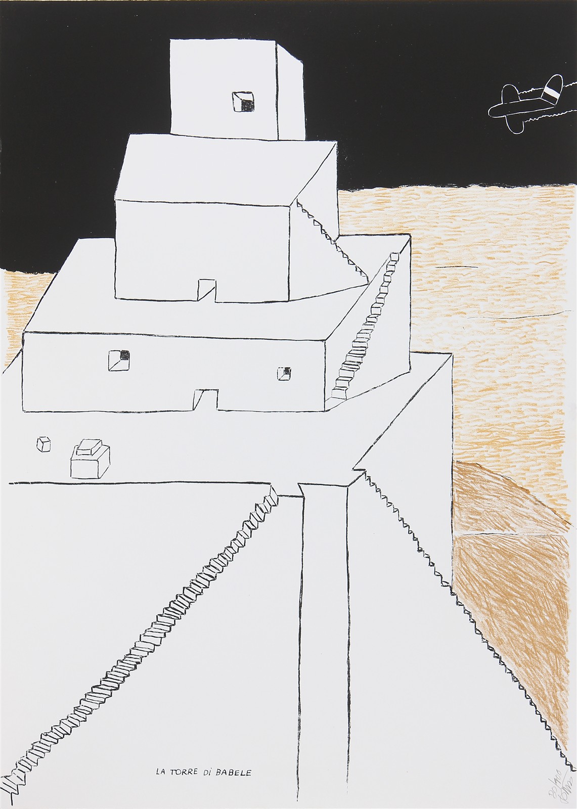SOTTSASS ETTORE (1917 - 2007) Lotto composto da n. due serigrafie. Il futuro, La torre di Babele. 2001. Serigrafia. Cm 90,00 x 70,00. 27/100. Tiratura e firma a matita in basso, 80/100. Tiratura e firma a matita in basso.