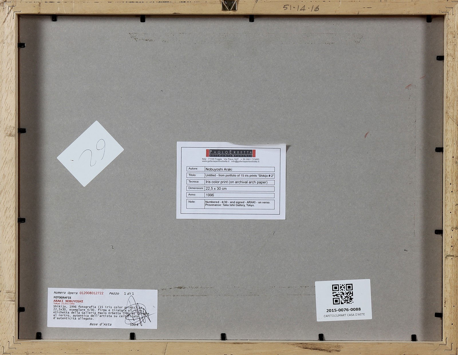 ARAKI NOBUYOSHI (n. 1940) Senza titolo. 1996. Fotografia. Cm 30,00 x 22,50. 4/30. Al retro cartiglio descrittivo a cura di Paolo Erbetta Arte Contemporanea, Foggia. Provenienza: Taka Ishii Gallery, Tokyo. Autentica su fotografia a cura di Paolo Erbetta Arte Contemporanea, Foggia. Cornice presente