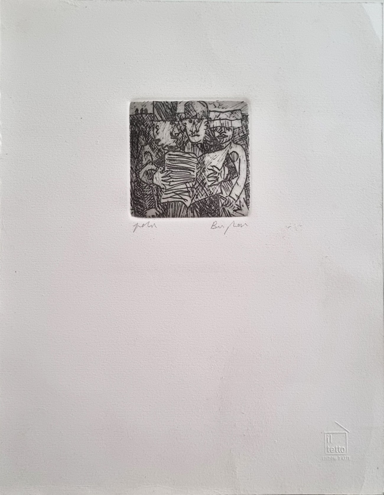 BORGHESE FRANZ Roma 1941 - 2005 "Senza titolo" Incisione su cartoncino cm 24x30,7 (foglio), cm 7,5x7 (disegno). Firma e timbro a secco "Il Tetto Grafiche d'arte" a destra, tiratura p.d.a. a sinistra. Provenienza Studio Borghese.