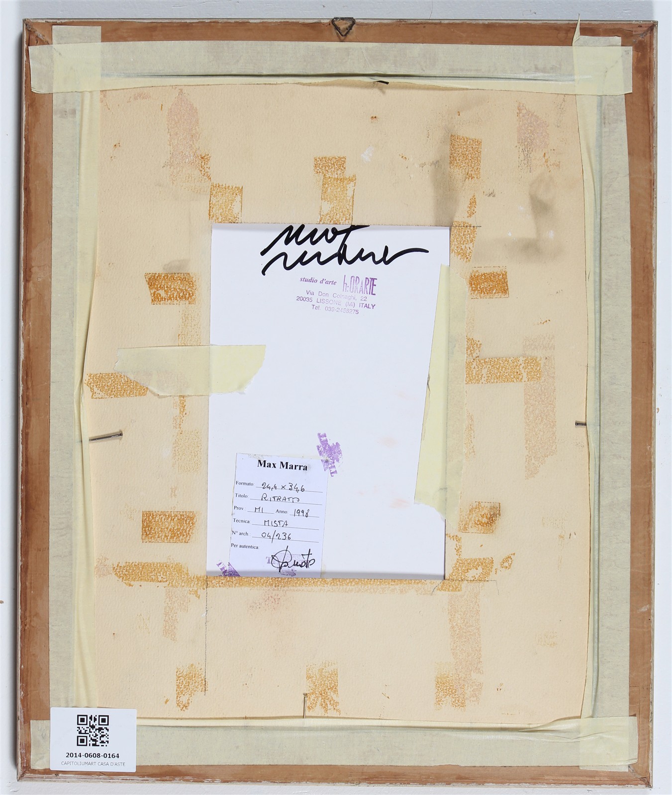 MARRA MAX (1950 - 2014) Volto. Tecnica mista su carta. Cm 34,60 x 24,40. Firma in basso a destra. Al retro firma, cartiglio Max Marra con timbro; Timbro galleria Studio D'arte Orarte, Lissone. Cornice presente