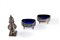 spargi zucchero a corpo tornito con parte superiore traforata e due saliere di forma ovoidale a corpo inciso con vaschette in vetro blu e due cucchiaini.