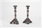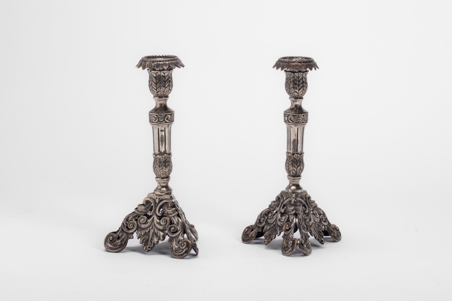 fusto tornito e cesellato a foglie e fiori stilizzati, base piramidale sbalzata e traforata a volute e foglie.