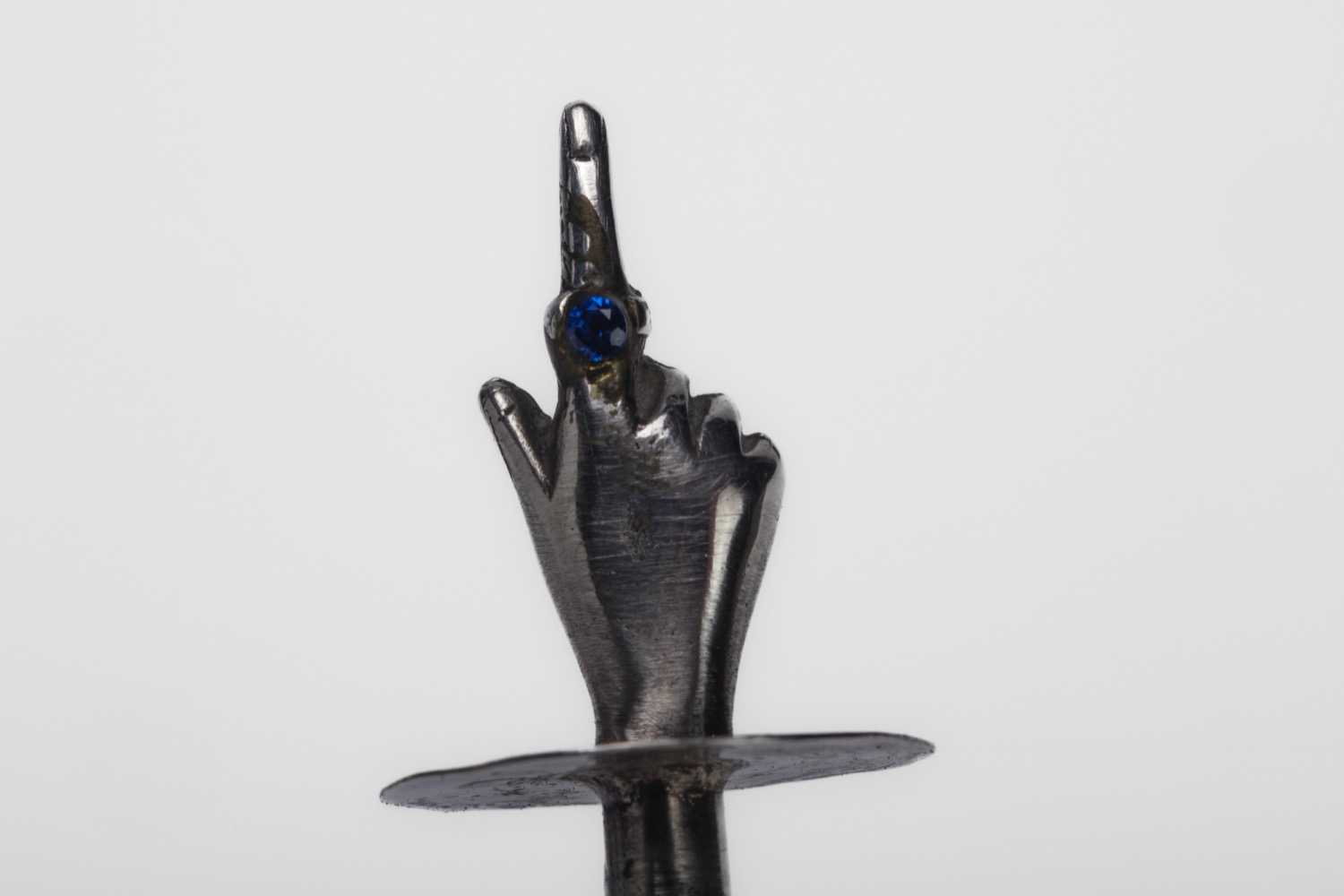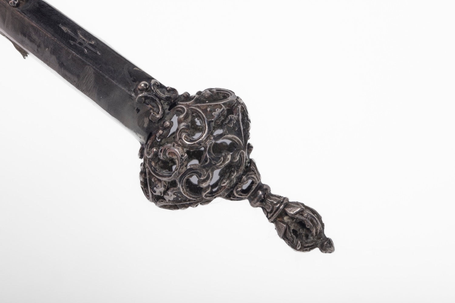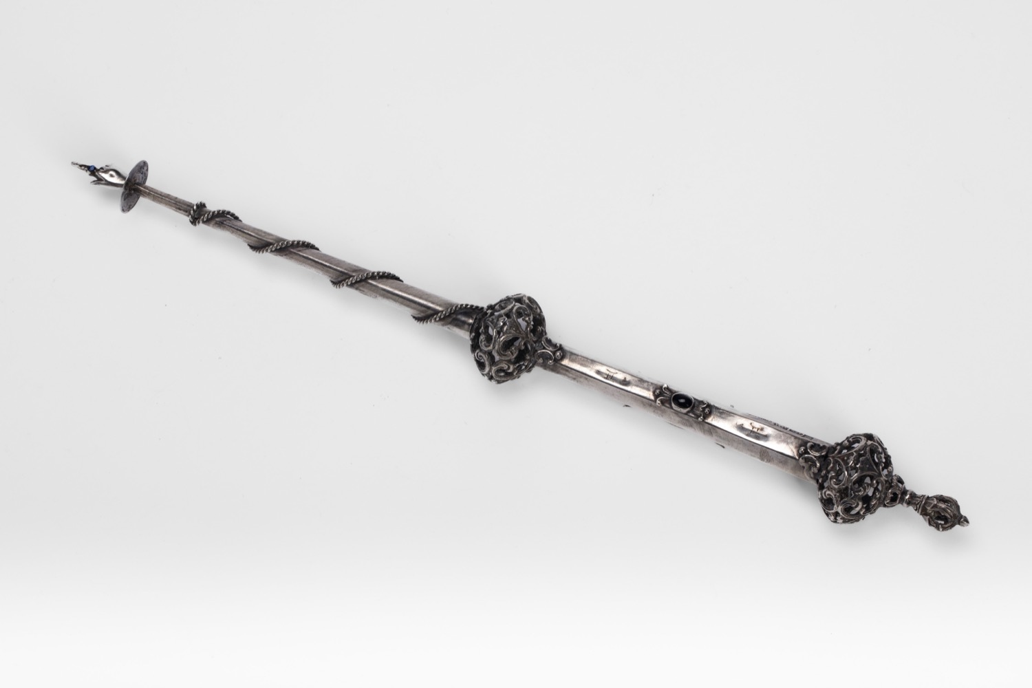 a corpo sfaccettato. Puntale con piccola mano stilizzata decorata con anellino in pietra dura, al centro e sul terminale motivo decorativo sferico traforato.