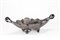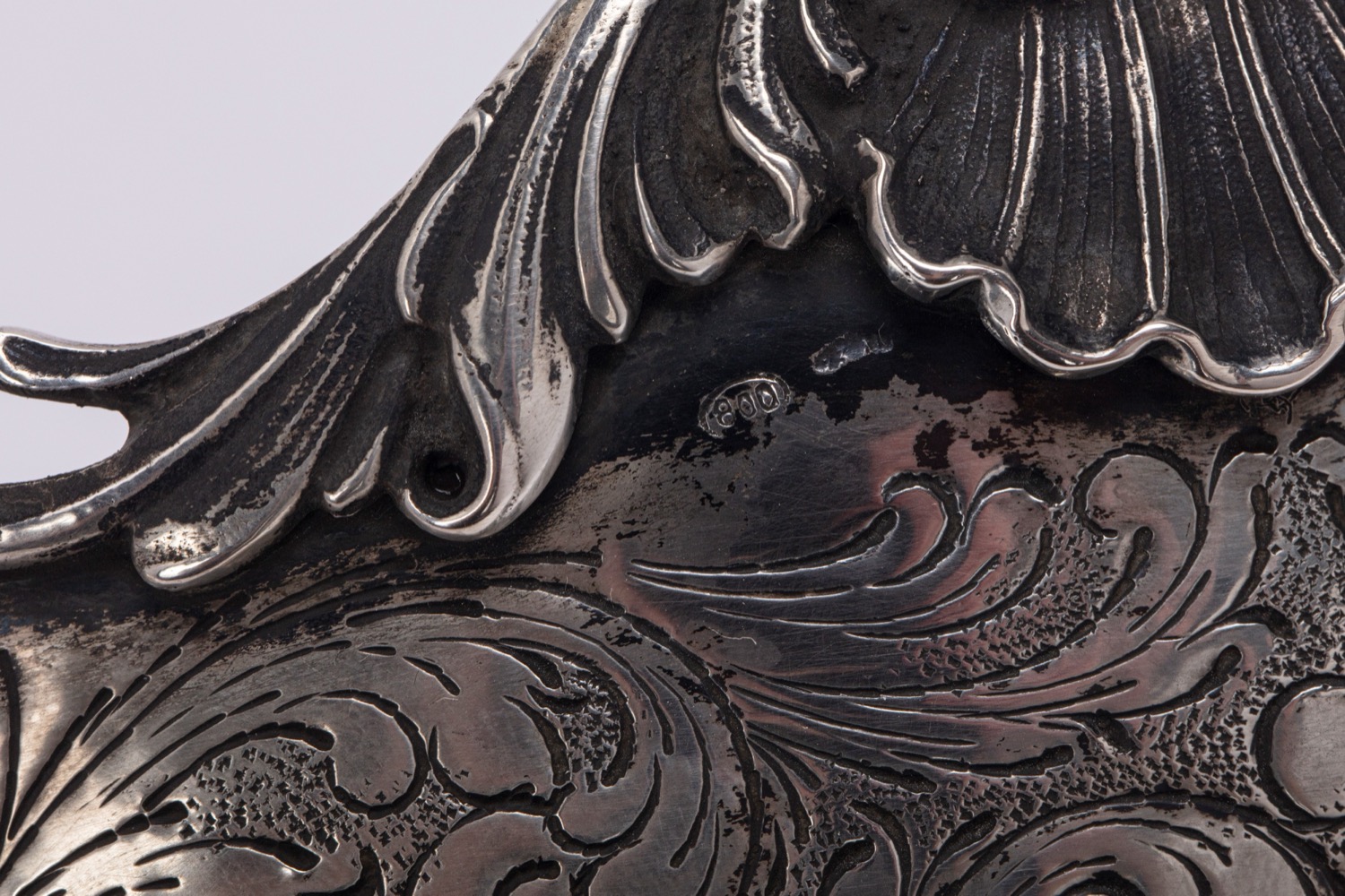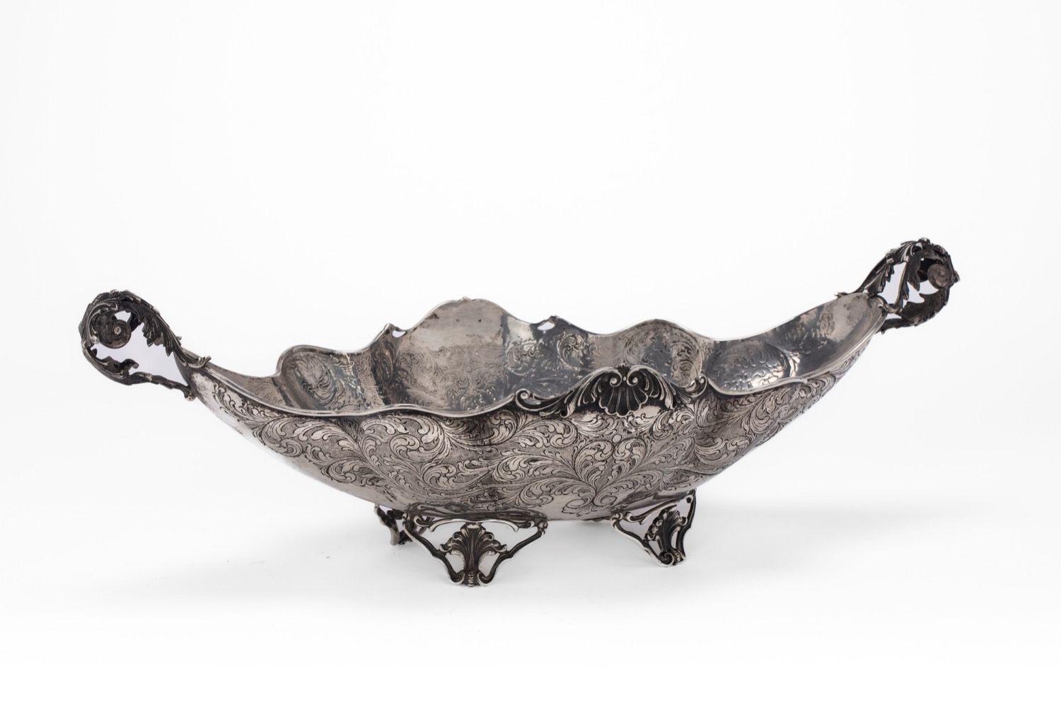 di forma allungata, con corpo decorato a leggera martellatura e fine incisione a volute, piedi, anse e bordo cesellati a foglie d'acanto e conchiglie stilizzate.
