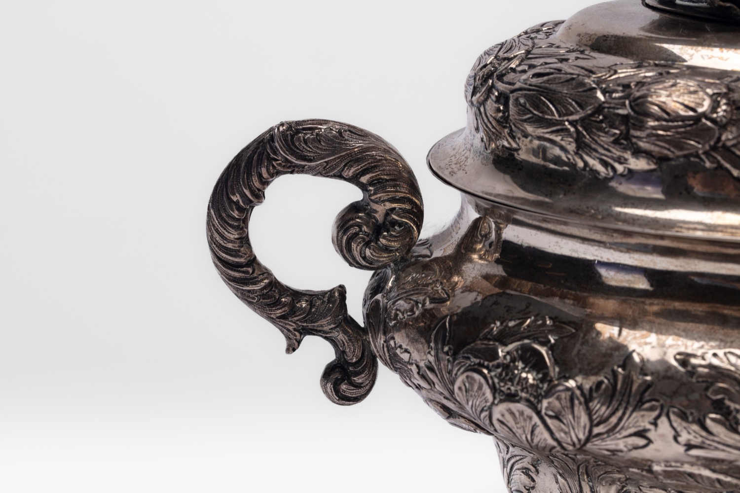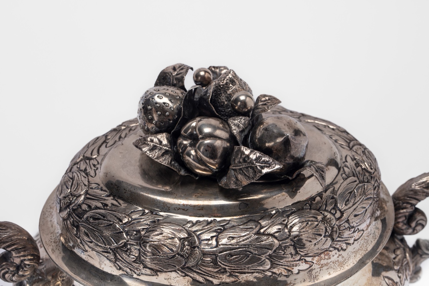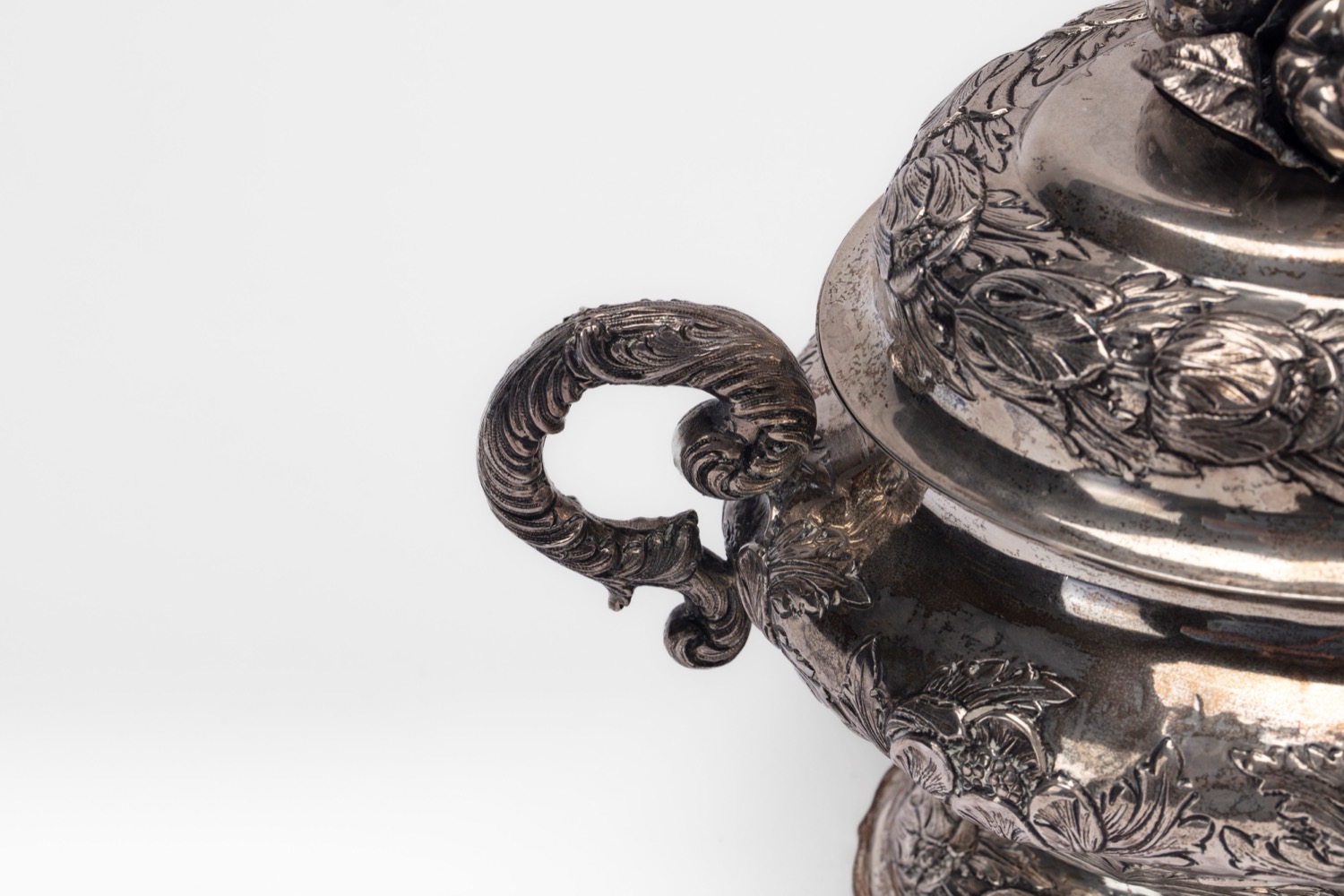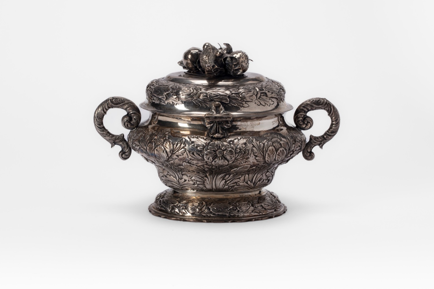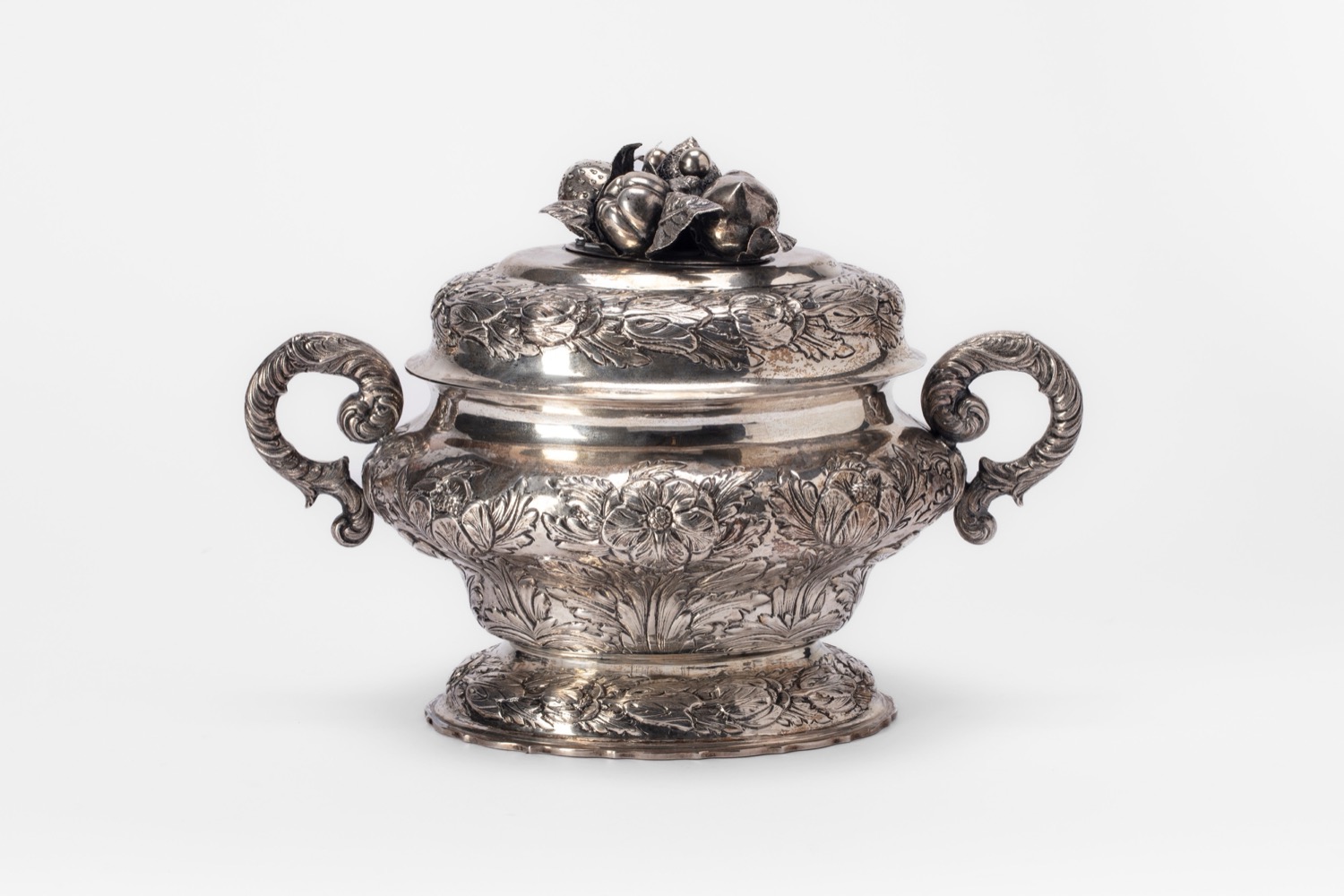 biansata, corpo di forma ovale riccamente sbalzato a motivi floreali e motivi fogliacei concatenati, prese mosse, coperchio decorato con frutti e foglie cesellati a tutto tondo, interno in vermeil.