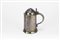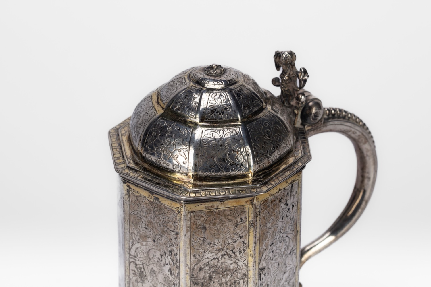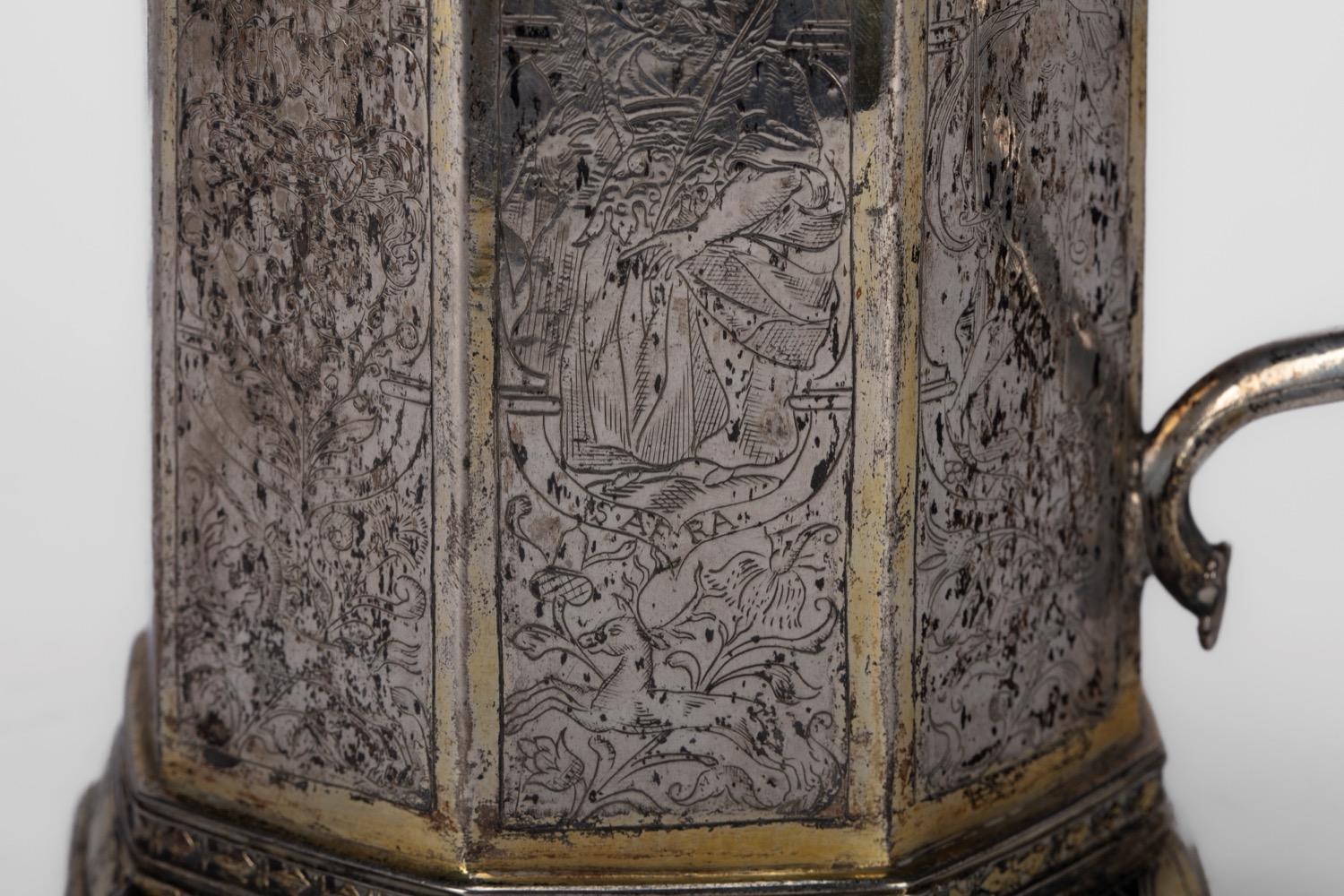 con tracce di doratura, a corpo ottagonale inciso a figure religiose entro cornici con decori ad animali e rami intrecciati, presa a doppia voluta con decoro a perlinature in rilievo, coperchio a cupola con presa cesellata a figura alata, interno in vermeil, punzoni abrasi alla base. Punzoni abrasi.