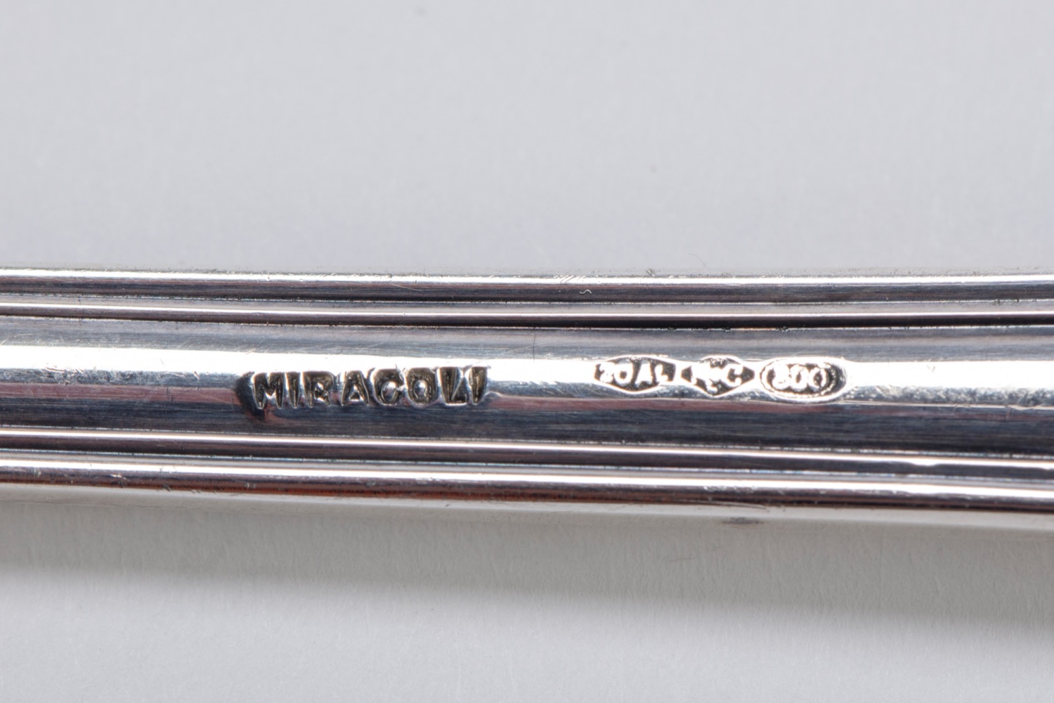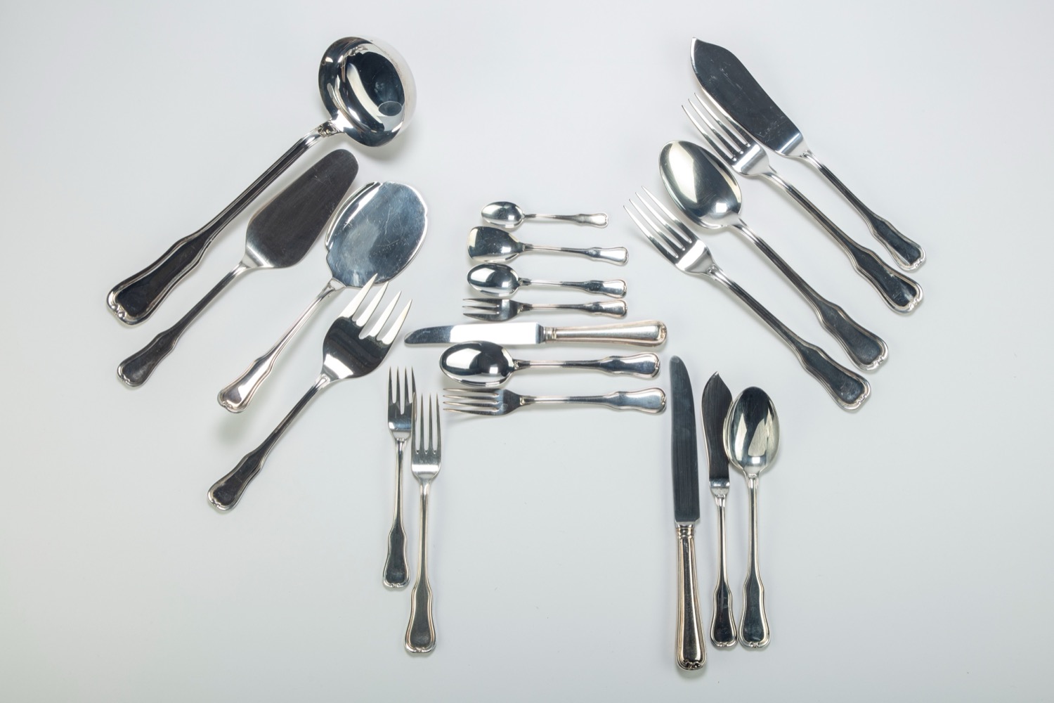 12 cucchiaini da caffè, 12 forchette da insalata, 12 forchette da dolce, 12 cucchiai da dolce, 12 cucchiai, 12 cucchiaini da tè, 12 forchette da pesce, 12 forchette, 12 coltelli da pesce, 12 coltelli, 12 coltelli da frutta, 10 palette da dolce, 1 cucchiaio da portata, 1 forchetta da portata, 1 mestolo, 1 forchetta da arrosto, 1 coltello da servizio pesce, 1 forchetta da servizio pesce, 2 palette da dolce.