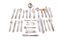 12 forchette, 12 coltelli, 12 cucchiai, 11 forchette da antipasto, 12 cucchiai da antipasto, 12 coltelli da antipasto, 12 forchette da pesce, 12 coltelli da pesce, 12 cucchiaini da tè, 10 cucchiaini da caffè, 12 forchettine da olive, 2 mestoli, 1 paletta e 1 coltello da dolce, 1 forchetta e 1 cucchiaio grandi di servizio, 9 posate varie di servizio.