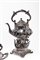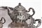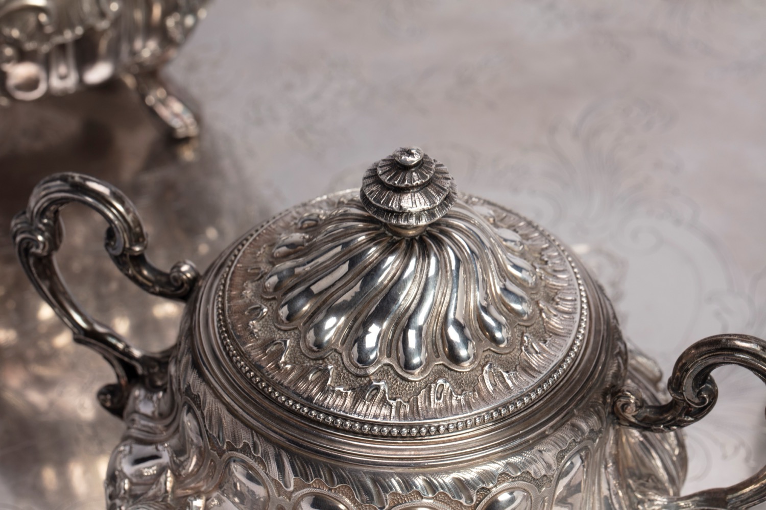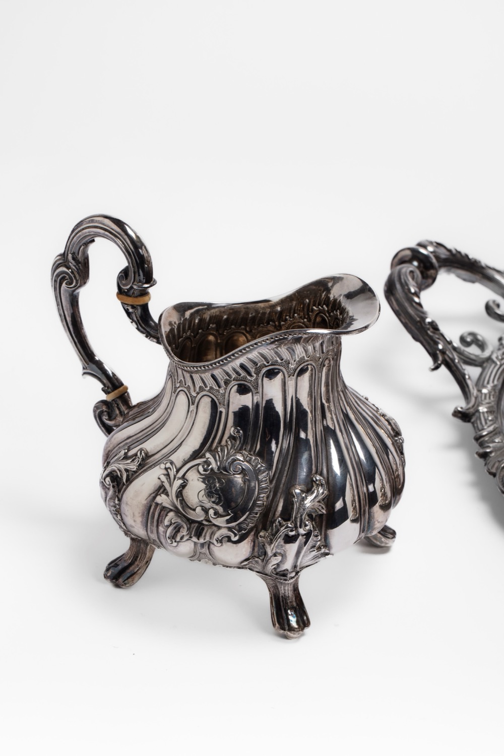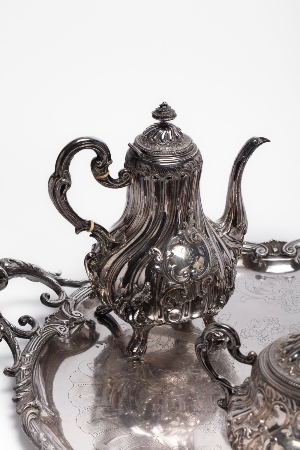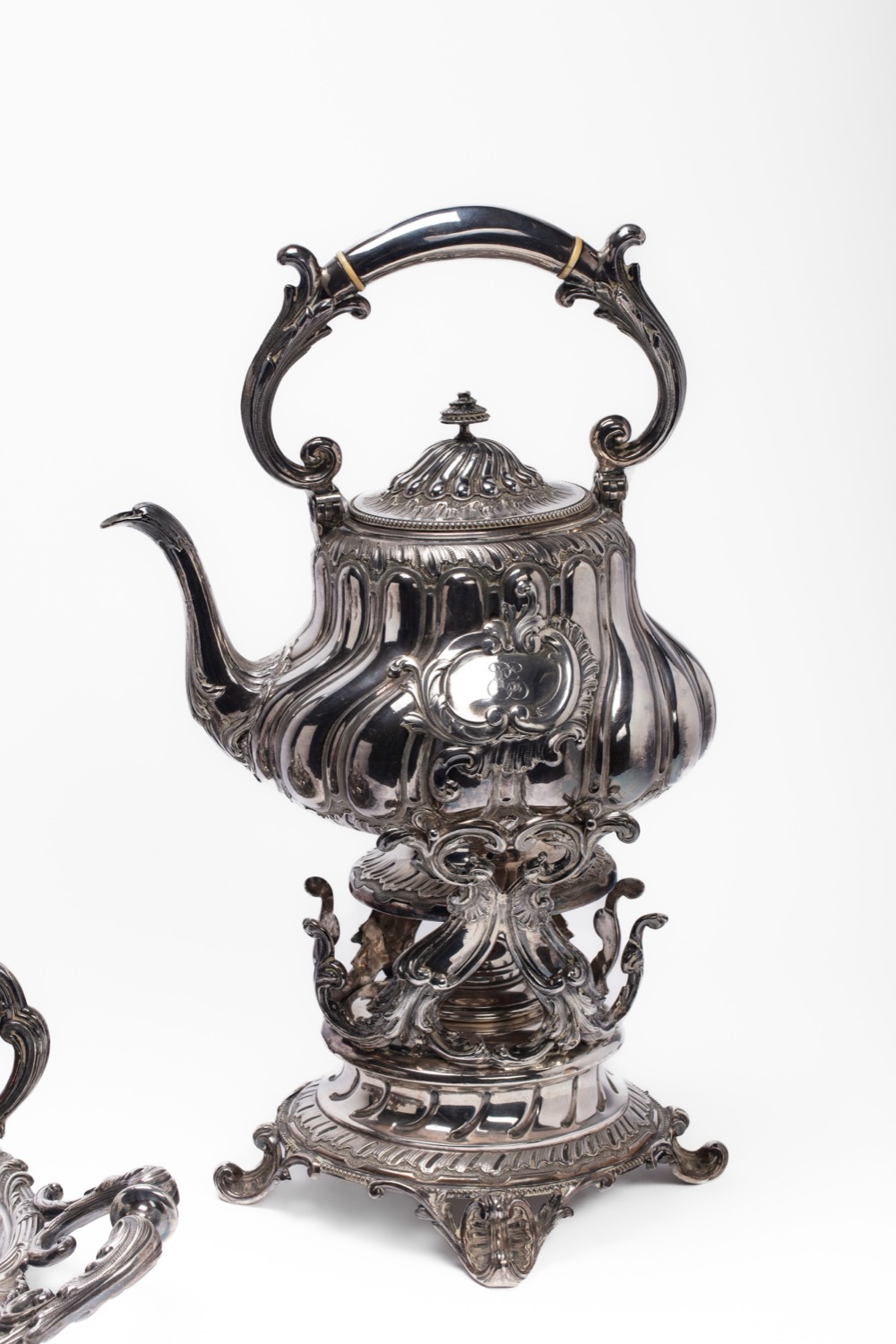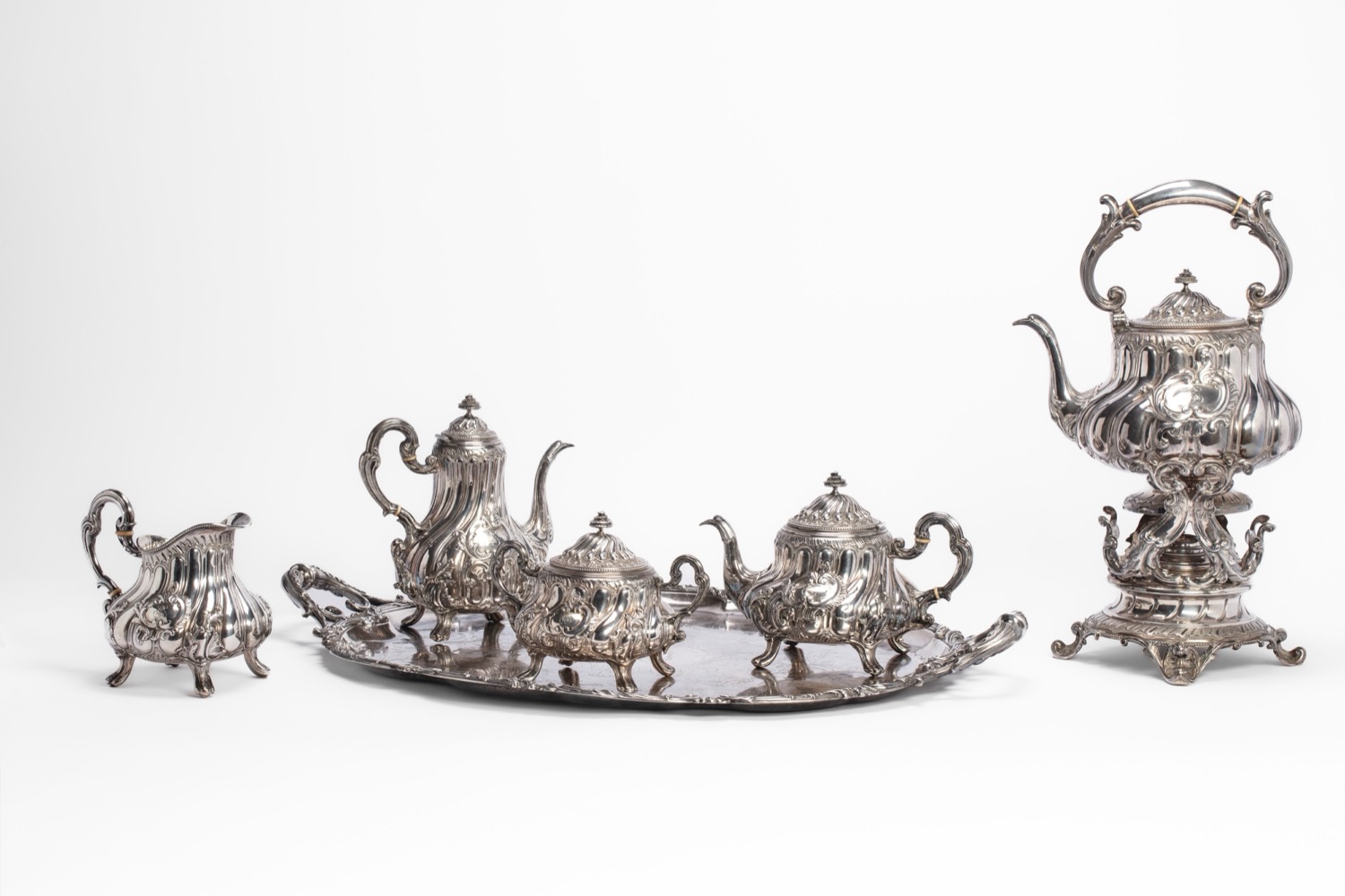 a corpo sbalzato a costolature alternate curve, e volute, prese e beccucci mossi e scanalati, coperchi con prese cesellate a motivo di conchiglia stilizzata, monogramma inciso su ogni pezzo.