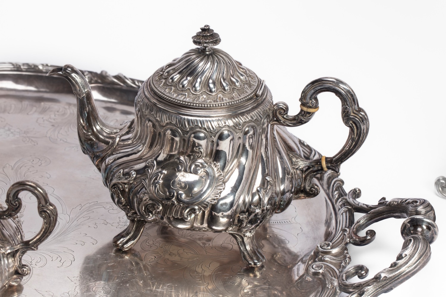 composto da caffettiera, teiera, zuccheriera, lattiera, grande samovar e vassoio,