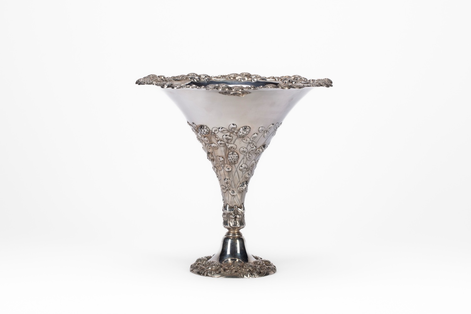 fusto di forma conica, con sbalzo a motivo floreale e decoro cesellato a rami fogliacei con crisantemi.