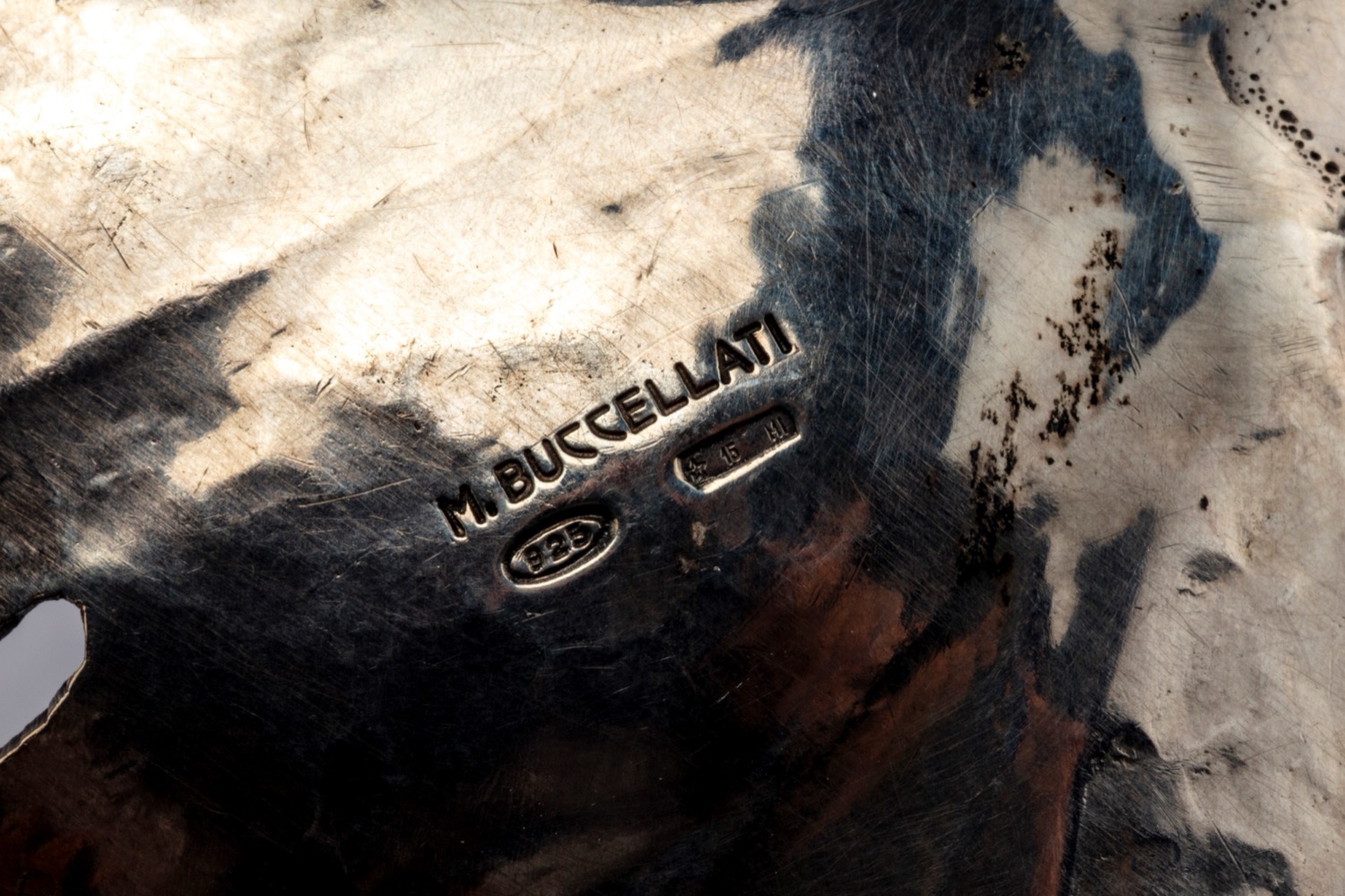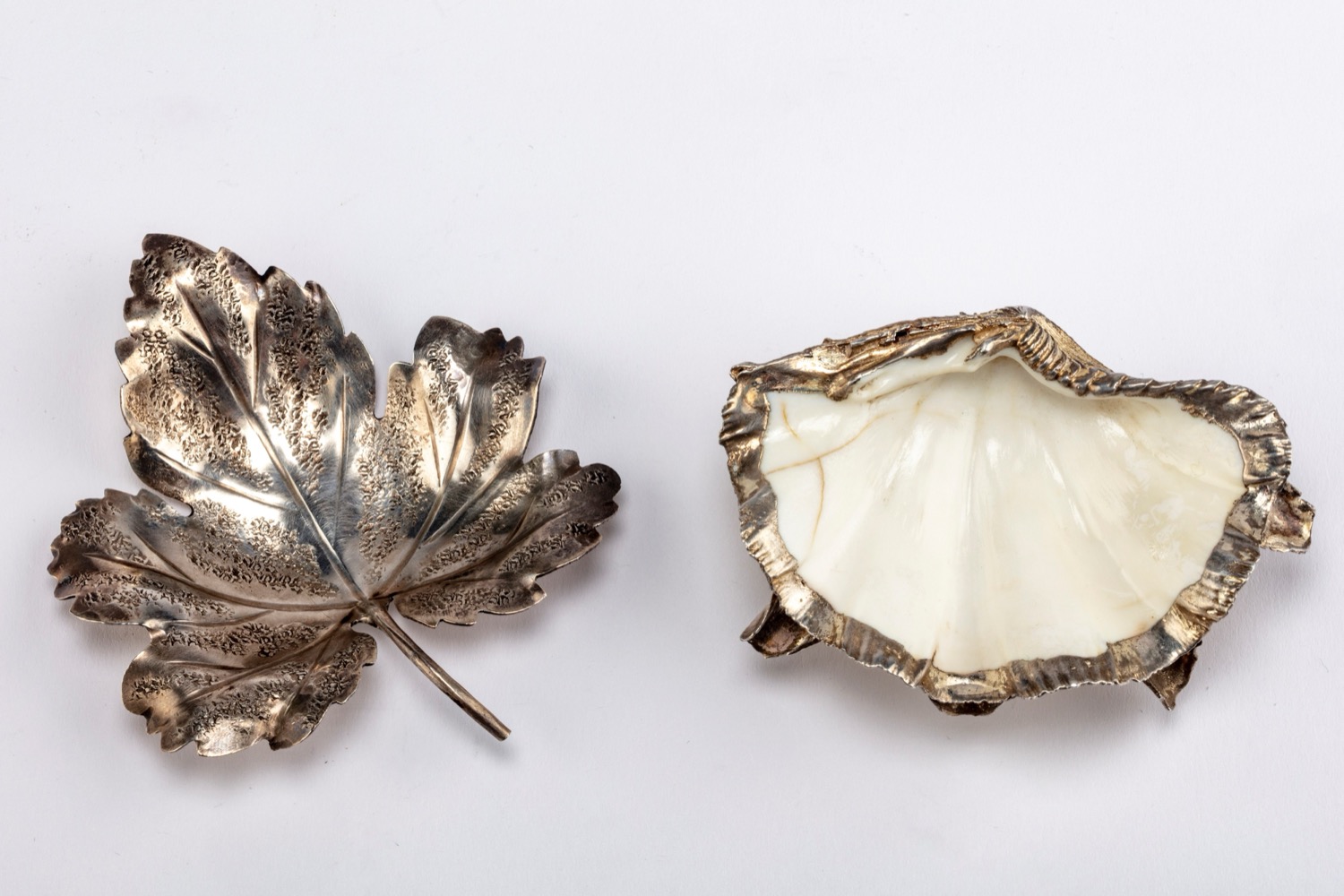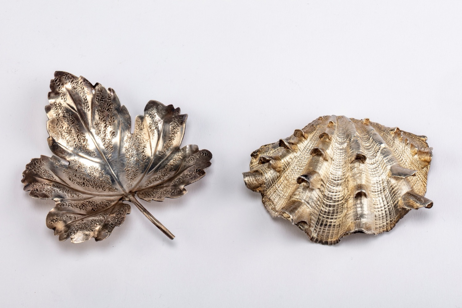 foglia sbalzata e incisa a firma Mario Buccellati, conchiglia rivestita in argento, non firmata.