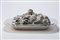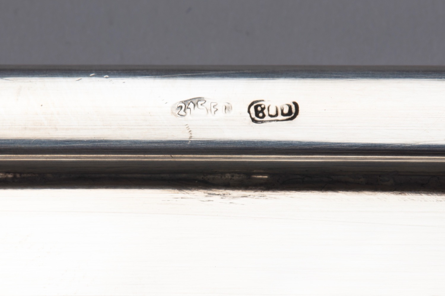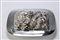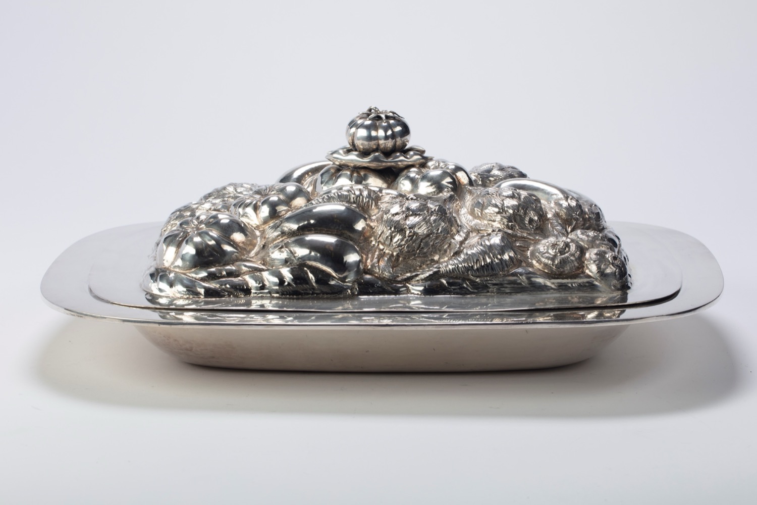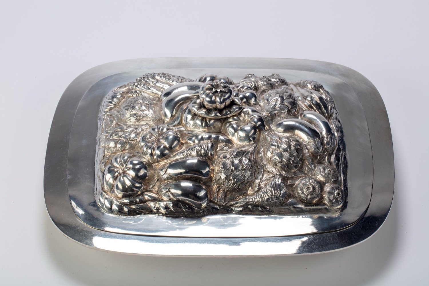 con coperchio riccamente sbalzato con motivi vegetali, presa del coperchio cesellata a forma di pomodoro a tuttotondo. (Lievi difetti).