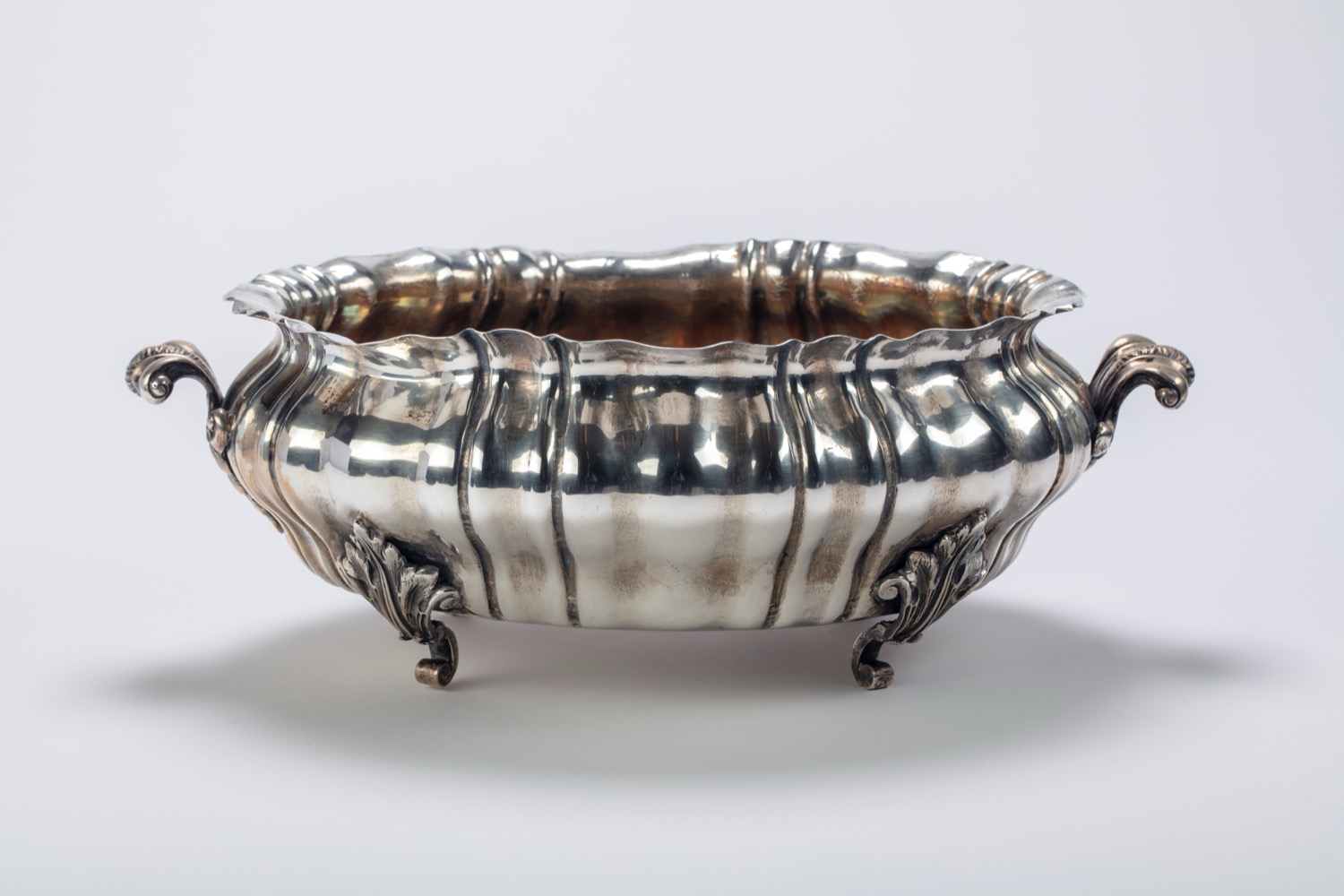corpo di forma bombata, decorato a costolatura, prese e piedini cesellati a foglie e volute.