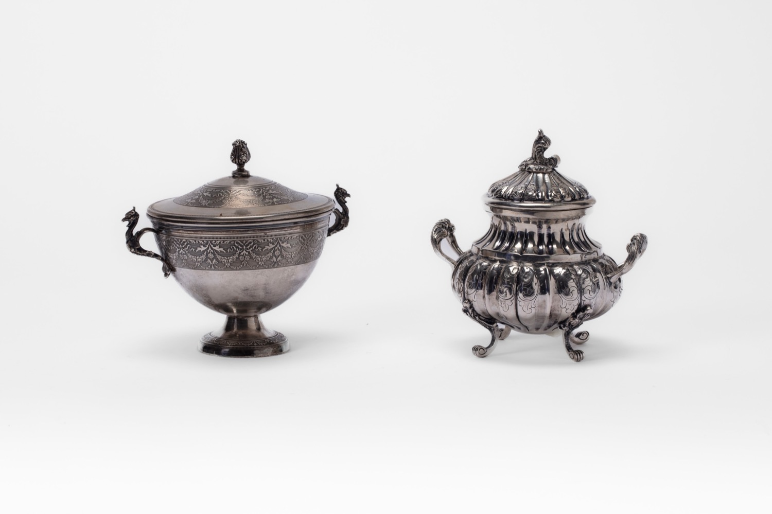 di diverso decoro, una con corpo finemente inciso a nastri e ghirlande floreali, una con corpo sbalzato e inciso a volute.