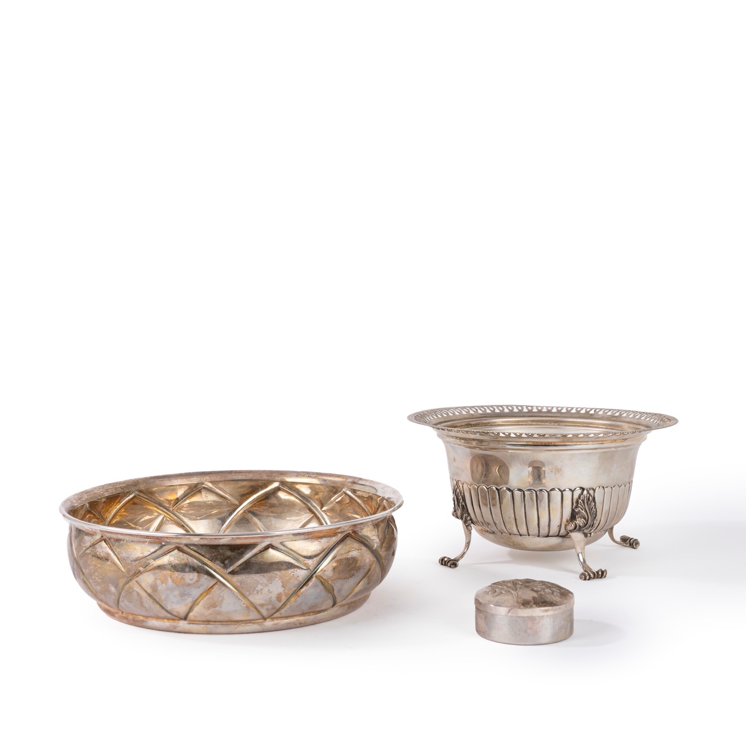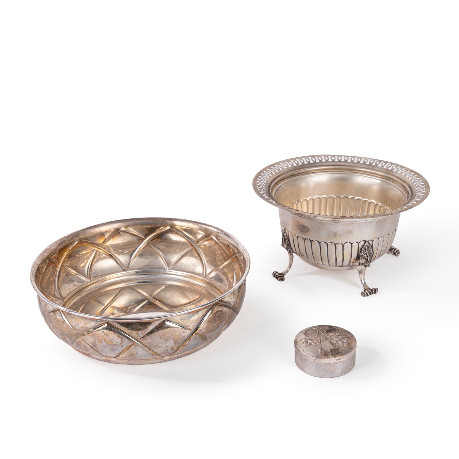 composto da un'alzatina a bordo traforato, una ciotola sbalzata e una scatolina porta pillole, a decori diversi.