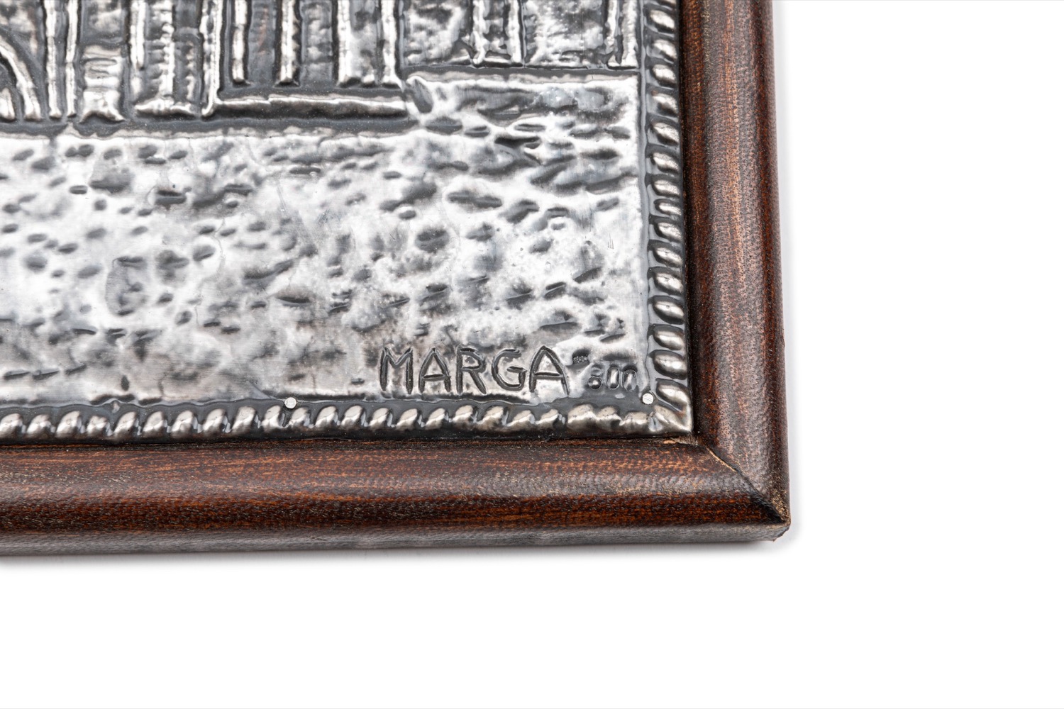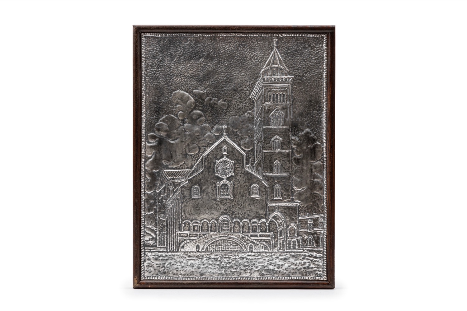 in lastra ad altorilievo raffigurante la Cattedrale di Trani, entro cornice in legno e pelle, firmato Marga.