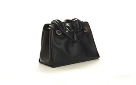 BULGARI Borsa in pelle nera a due manici, tre scomparti interni, rivestiti in camoscio azzurro, motivo arricciatura su entrambi i lati con mostrina circolare in acciaio cromato con impresso BULGARI, ultimo decennio Cm 26x33 black gathered leather bag with 2 handles, 3 light blue suede internal lined compartments and 2 stainless steal "Bulgari" inscribed appliquè circles on either side
