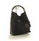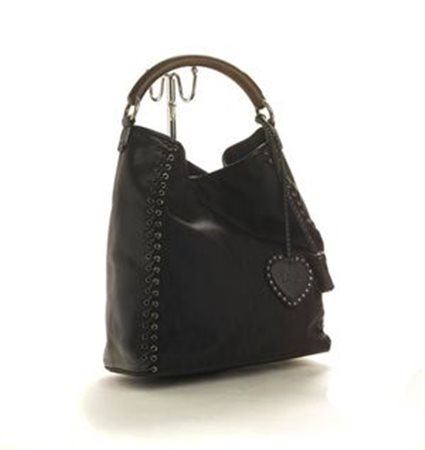 CHRISTIAN DIOR Borsa in pelle nera e lessuto con logo, manico in legno, modello a secchiello, linea Etnic Hobo, pendenti laterali, 2009 Cm 31x36 2009 Etnin Hobo model, black leather and fabric bucket shaped logo bag with wooded handle and hanging tassles