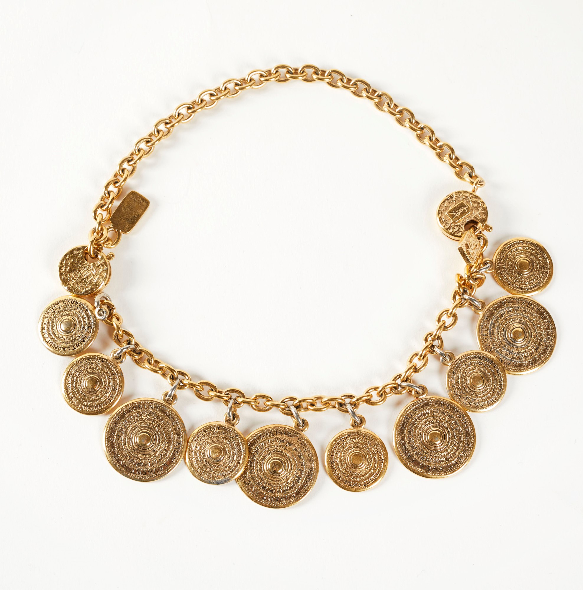 YVES SAINT LAURENT Collana in metallo dorato a catena con ciondoli a medaglione. Lunghezza collana: cm 44. Reca marchio YSL.
