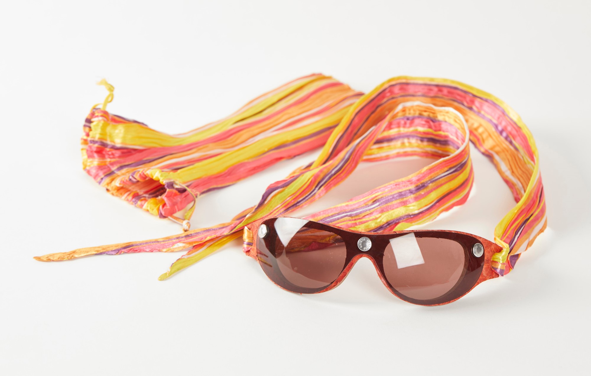 ROBERTO CAVALLI Occhiali da sole con mascherina in cuoio stampato pitone (mascherina rimovibile e intercambiabile) e lacci in tessuto colorato (anch'essi intercambiabili). Corredati di custodia in tessuto.