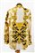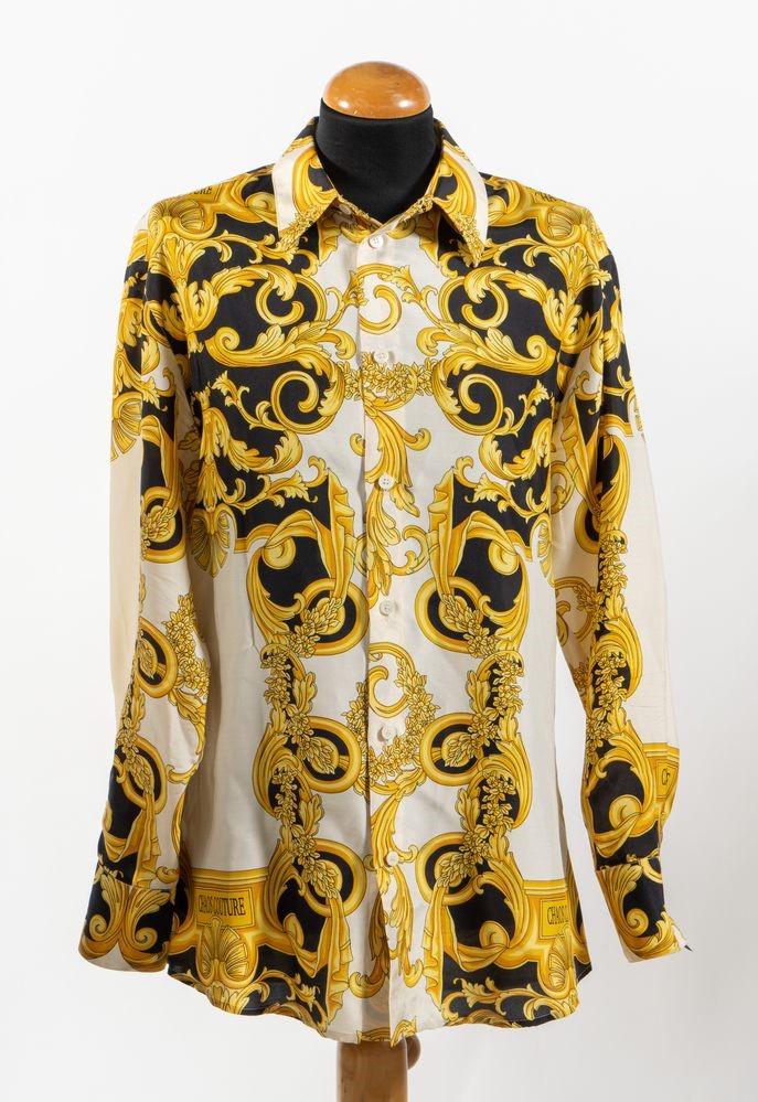 VERSACE Camicia in seta "Chaos Couture" con motivo barocco arabescato sui toni del giallo, del nero e del panna. Taglia IT 46. Reca etichetta Versace, Made in Italy. (lievi difetti)