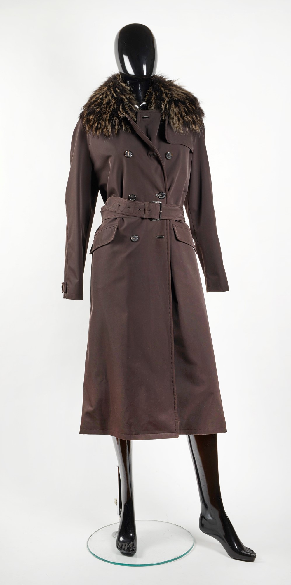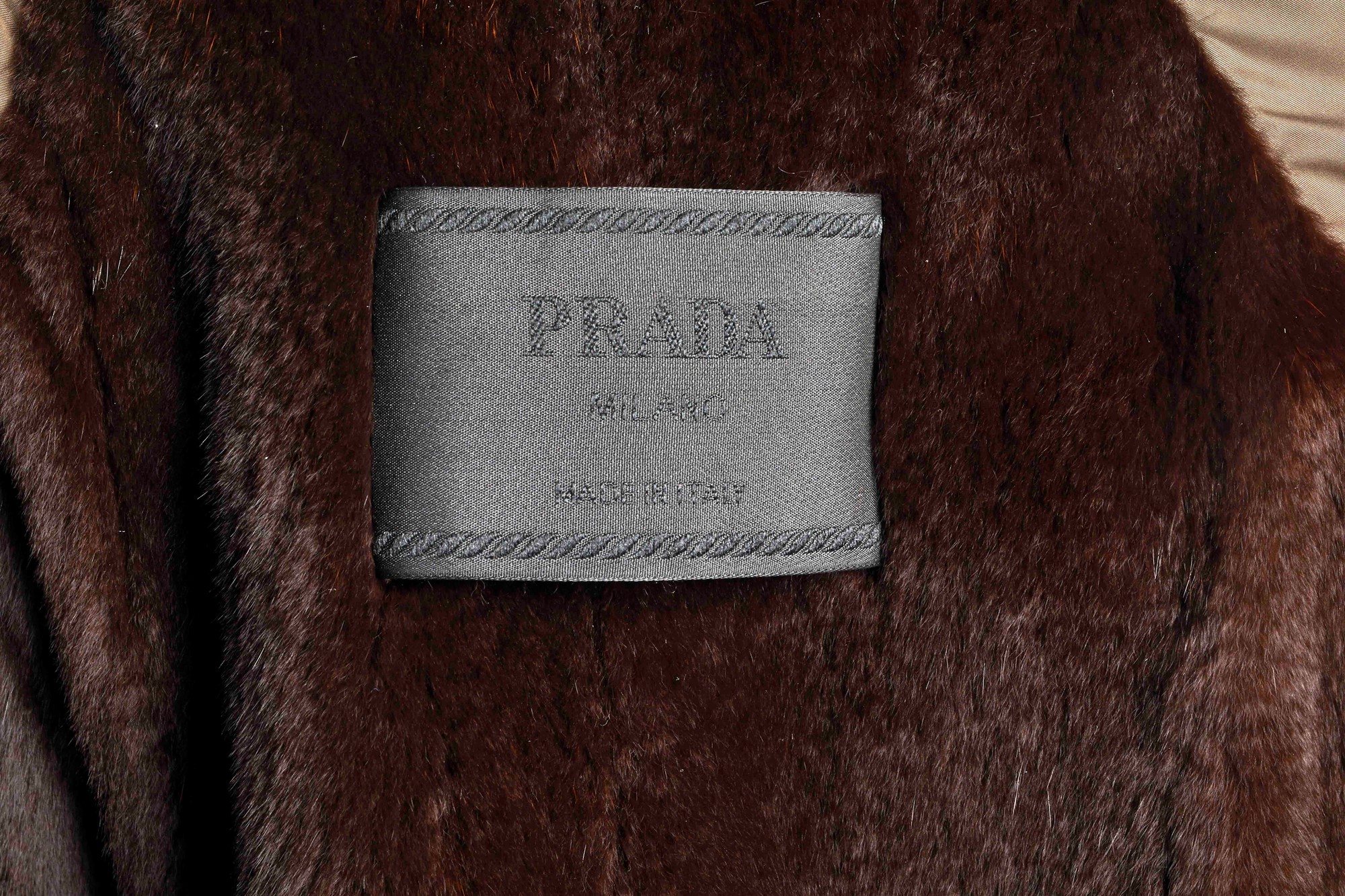 PRADA Capotto in nylon, con inserti in pelliccia e pelle. Interno in pelo. Reca cintura in vita. Taglia IT 40. Reca etichetta Prada, Milano.
