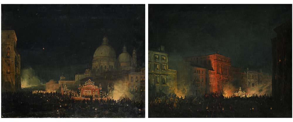 Carlo Grubacs (Venezia 1802 - Venezia 1878) Coppia di olii su tela: Festeggiamenti notturni a Venezia e Festeggiamenti notturni