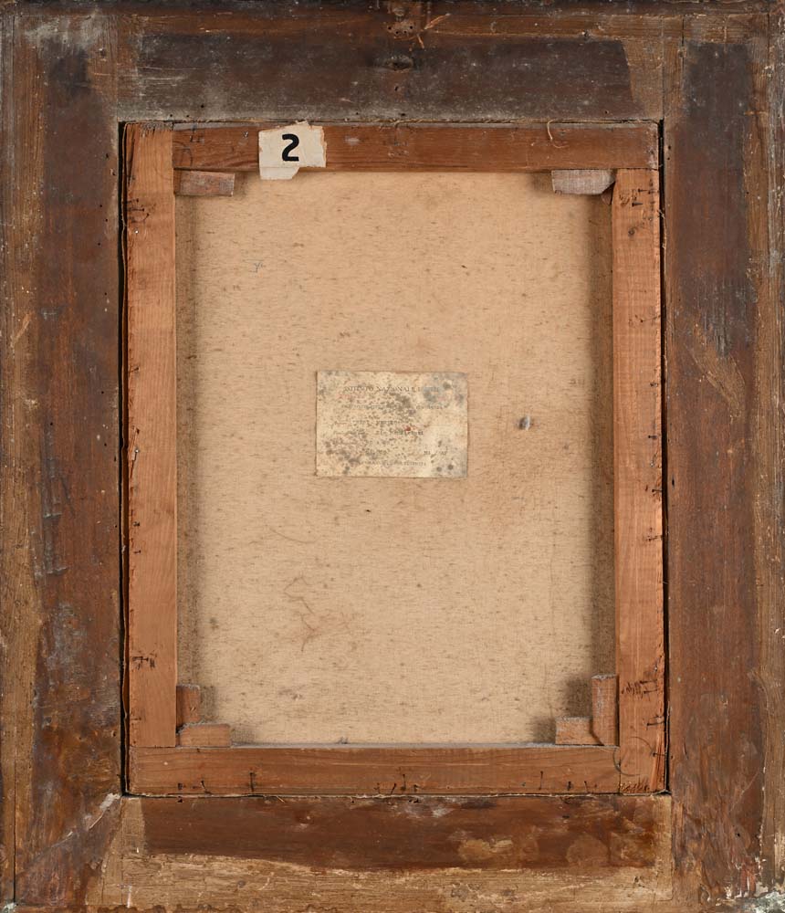 Sul retro, sulla tela, cartellini a stampa con scritti riferimenti al dipinto; sul telaio cartellino con numero di riferimento (2). olio su tela cm 50 x 40 – in cornice cm 69 x 59,5