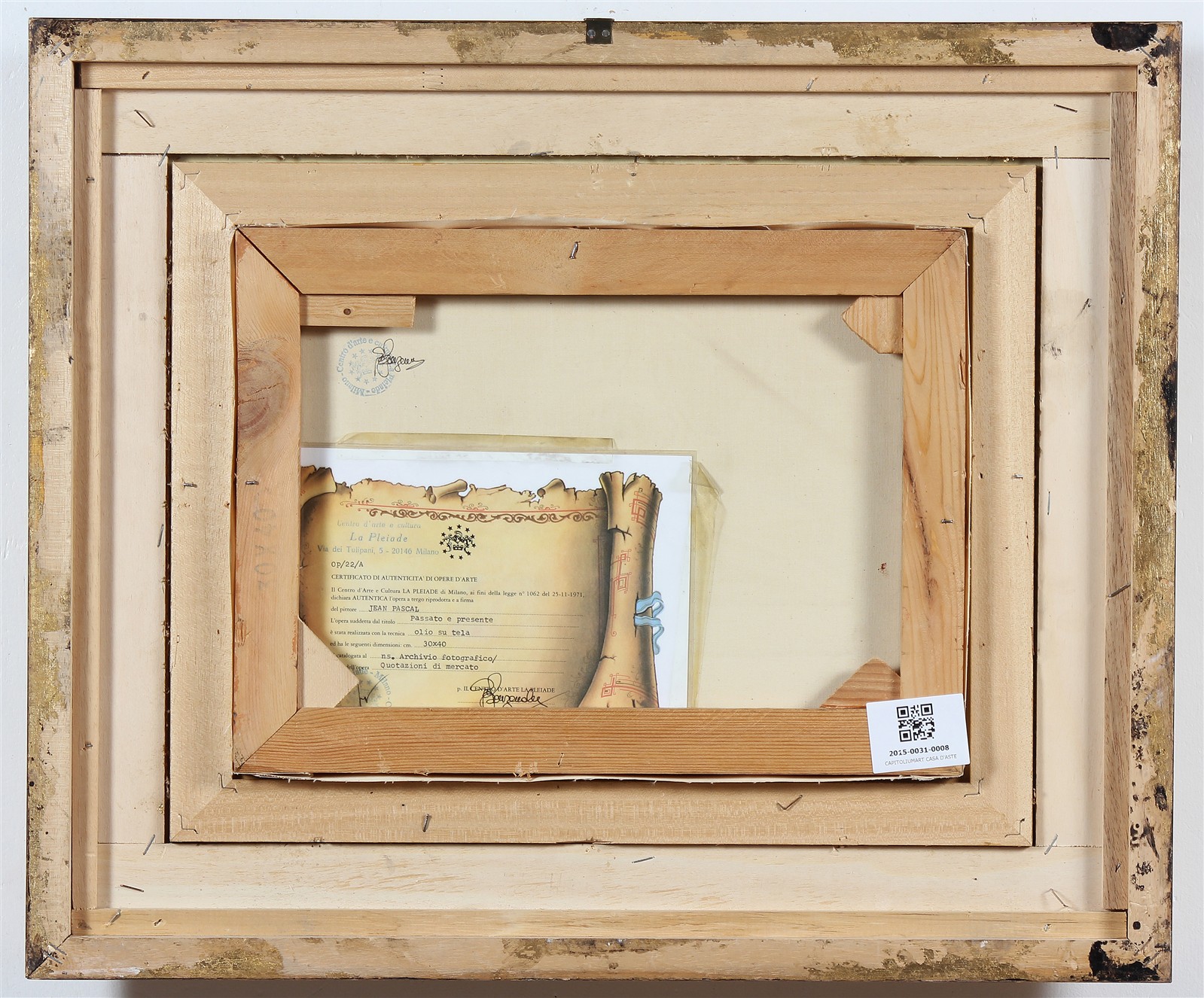 PASCAL JEAN (n. 1927) Passato e presente. Olio su tela . Cm 40,00 x 30,00. Firma in basso a sinistra. Al retro timbro a cura del Centro d'arte e Cultura La Pleiade, Milano. Certificato di autenticità a cura del Centro d'Arte e Cultura La Pleiade, Milano come da documentazione allegata. Cornice presente