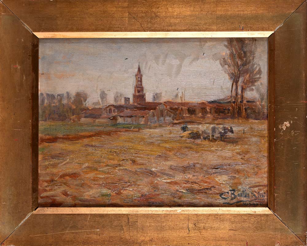 Campi con paese in lontananza firmato in basso a destra C Balestrini / MILANO olio su tavola cm 23 x 31 - in cornice cm 32 x 39,5
