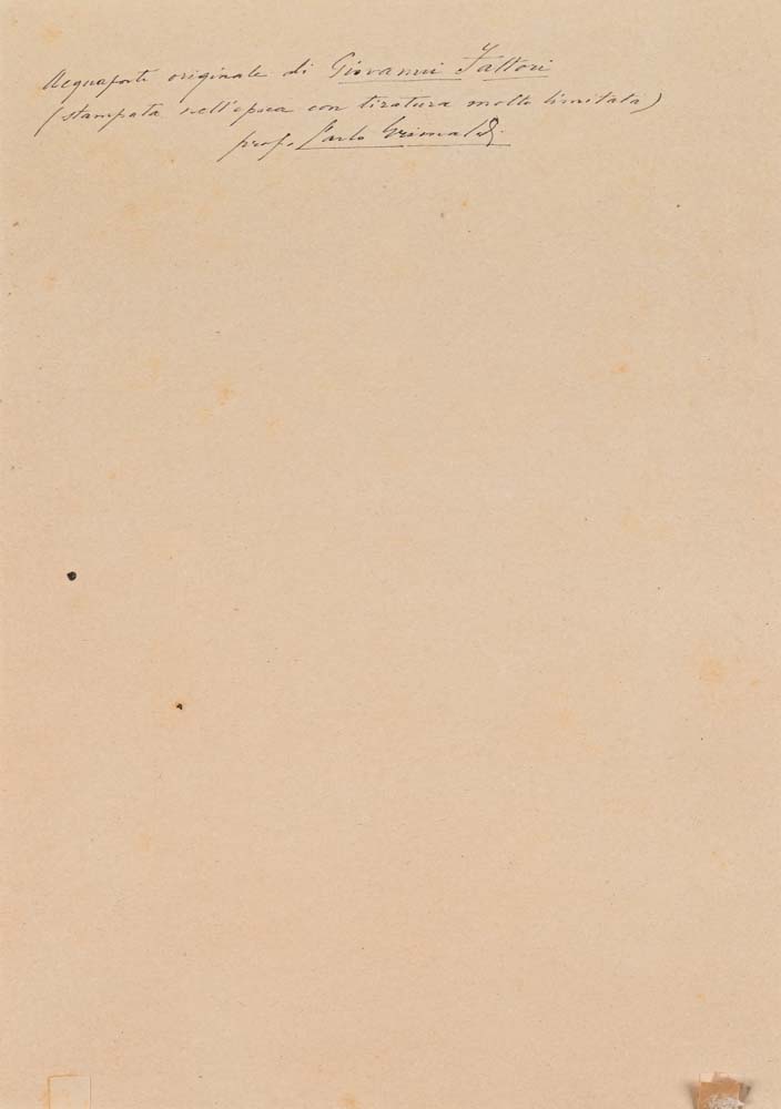 Sul retro dichiarazione di autenticità a firma di Carlo Grimaldi: acquaforte originale di Giovanni Fattori / (stampata nell'epoca con tiratura molto limitata) / prof. Carlo Grimaldi