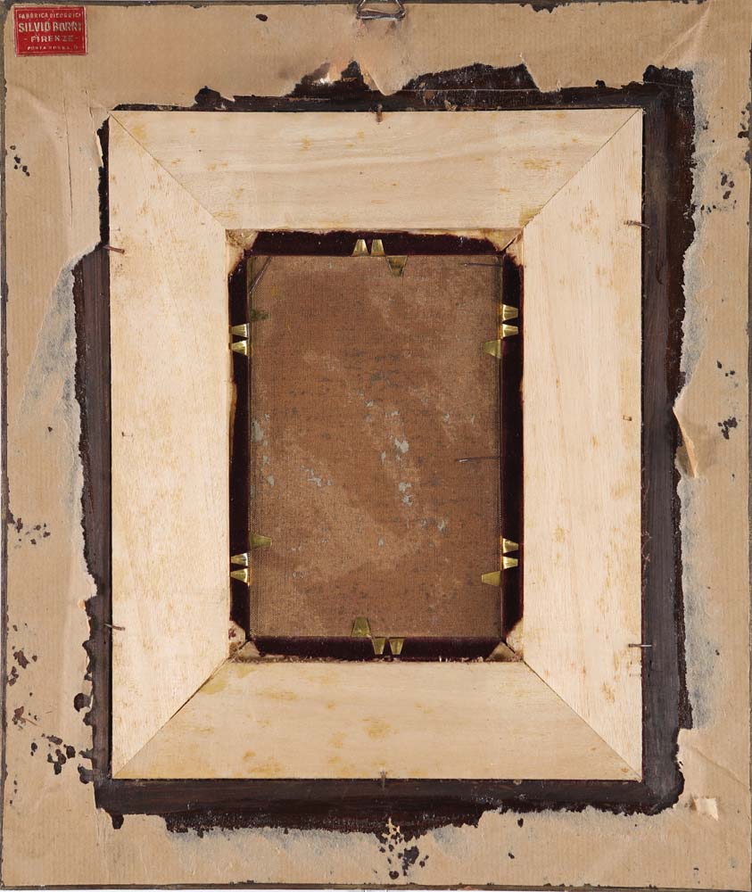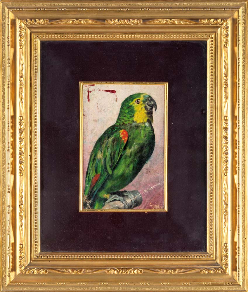 Pappagallino firmato in alto a sinistra E F ... olio su tela non intelaiata cm 15,5 x 10,3 – in cornice cm 36 x 30,5