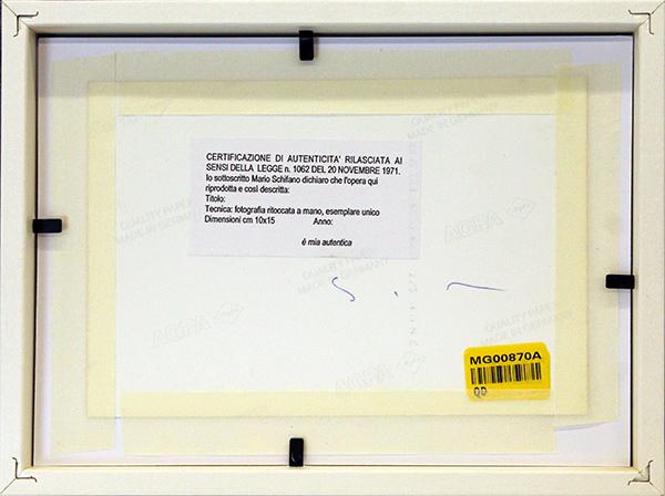 MARIO SCHIFANO, Senza titolo, 1990-1997, fotografia dipinta a mano, dim. 10x15 cm. Al verso: scheda descrittiva e firma dell'autore. Opera archiviata presso l'Archivio generale dell'Opera di Mario Schifano al N°F90-97/6846 in data 08/10/2007 a Roma. Opera pubblicata sul Catalogo Fondazione M.S Multistudio alla pag. 301 del volume V e sul Catalogo Fotografie Ritoccate alla pag. 95 del volume I. Opera con cornice