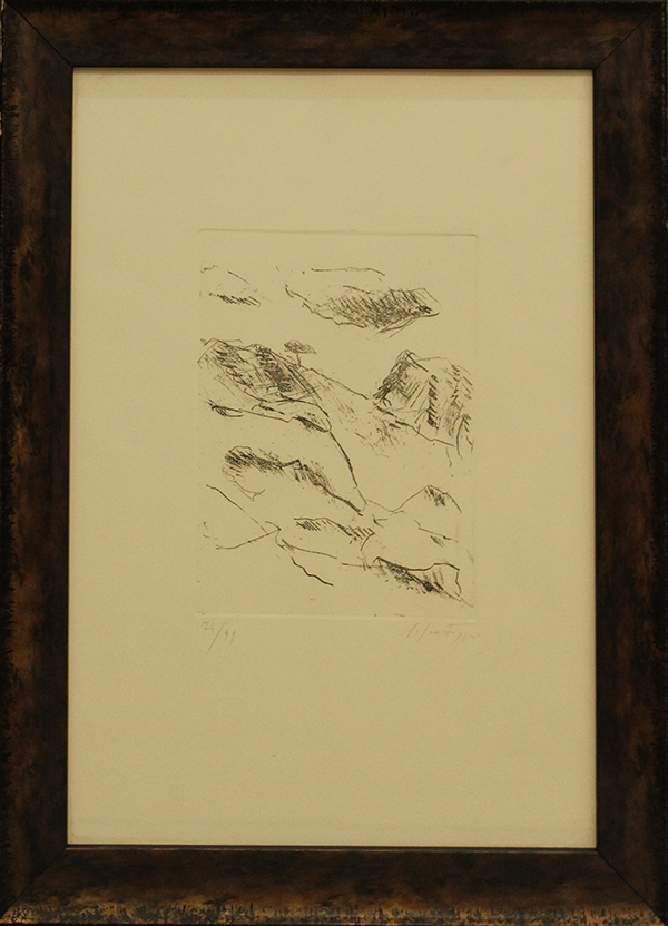 SERGIO SCATIZZI, anni '80, incisione su carta, esemplare 74/99, 49x34 cm, con cornice 57x42x3 cm, 1 kg. Al fronte: tiratura in basso a sinistra e firma in basso a destra. Opera con certificato di provenienza della Daliano Ribani Arte. Opera con cornice.