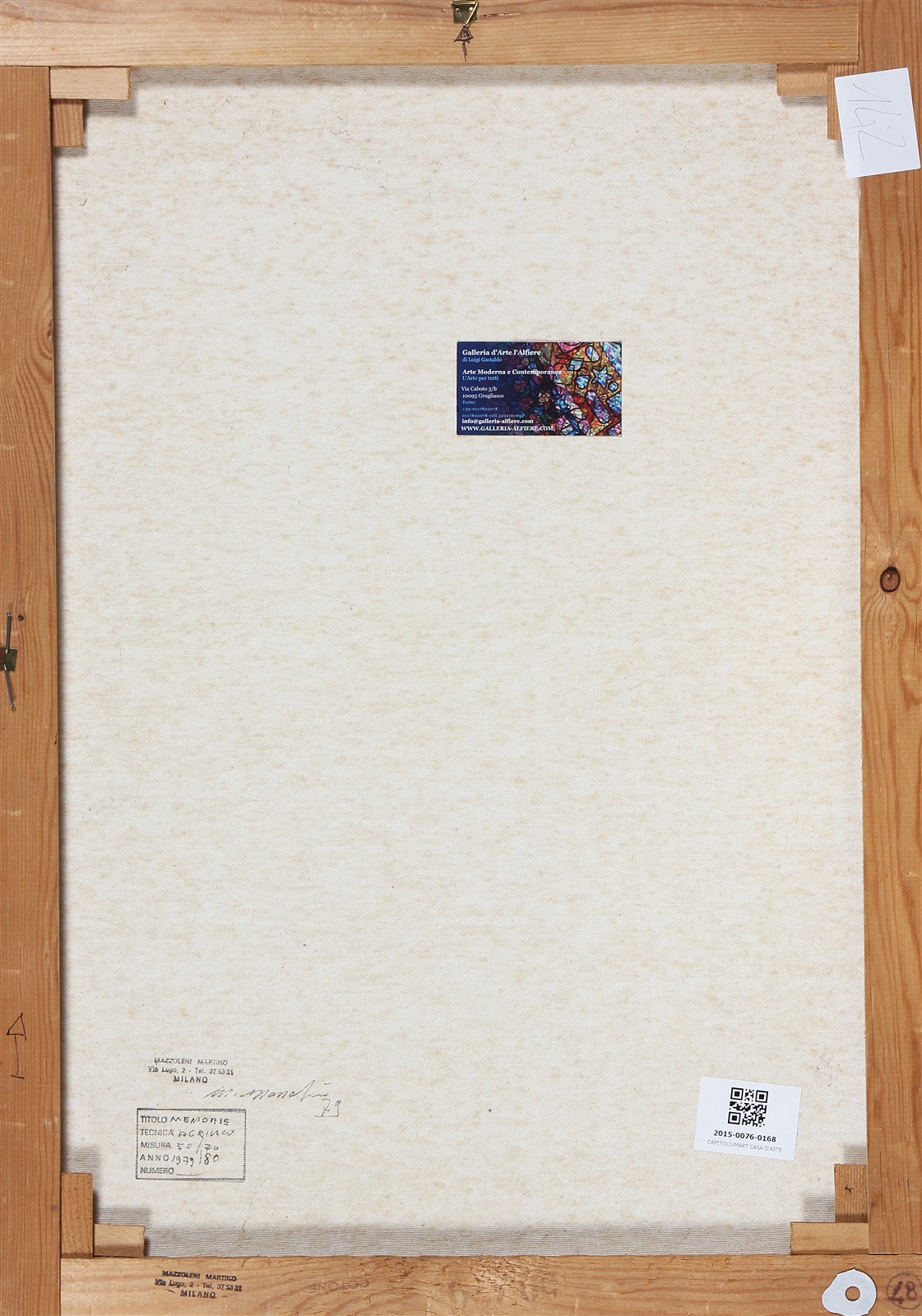 MAZZOLENI MARTINO (1935 - 1995) Memorie. 1979. Olio su tela . Cm 50,00 x 70,00. Al retro firma, anno e timbro dell'artista; etichetta della Galleria d'Arte l'Alfiere di Luigi Gastaldo, Grugliasco (To).